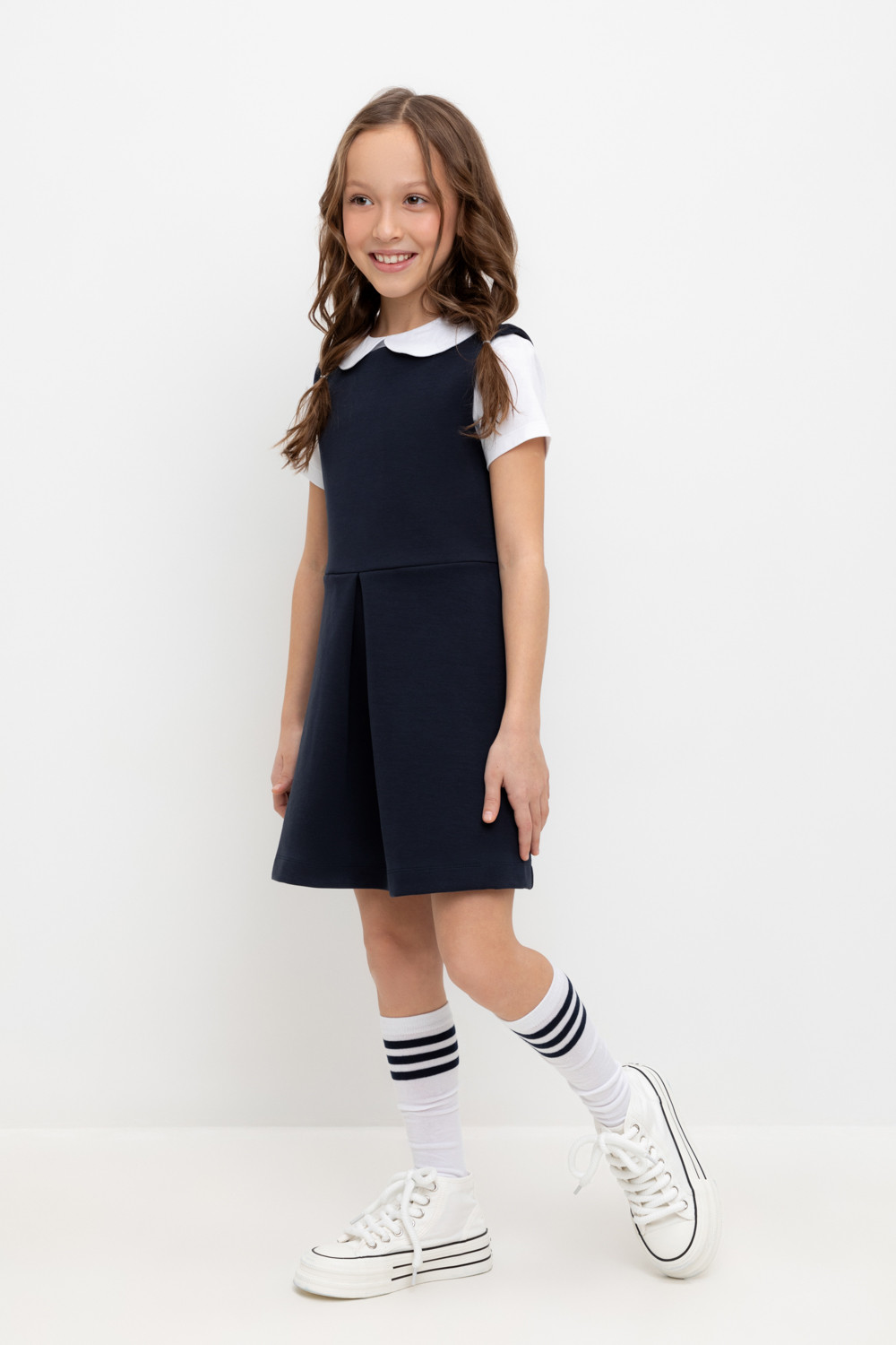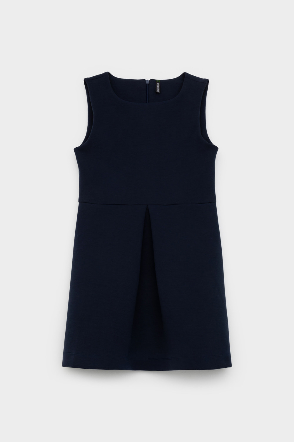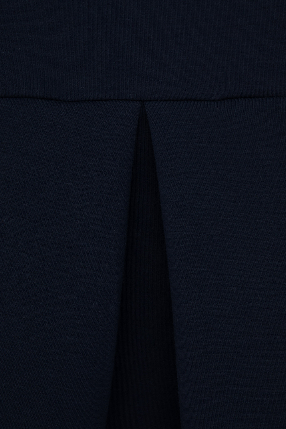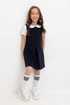Сарафан школьный для девочки. Сшит из плотного трикотажа тёмно-синего цвета. Застёгивается на спинке на потайную молнию. Украшен широкой складкой впереди по центру.