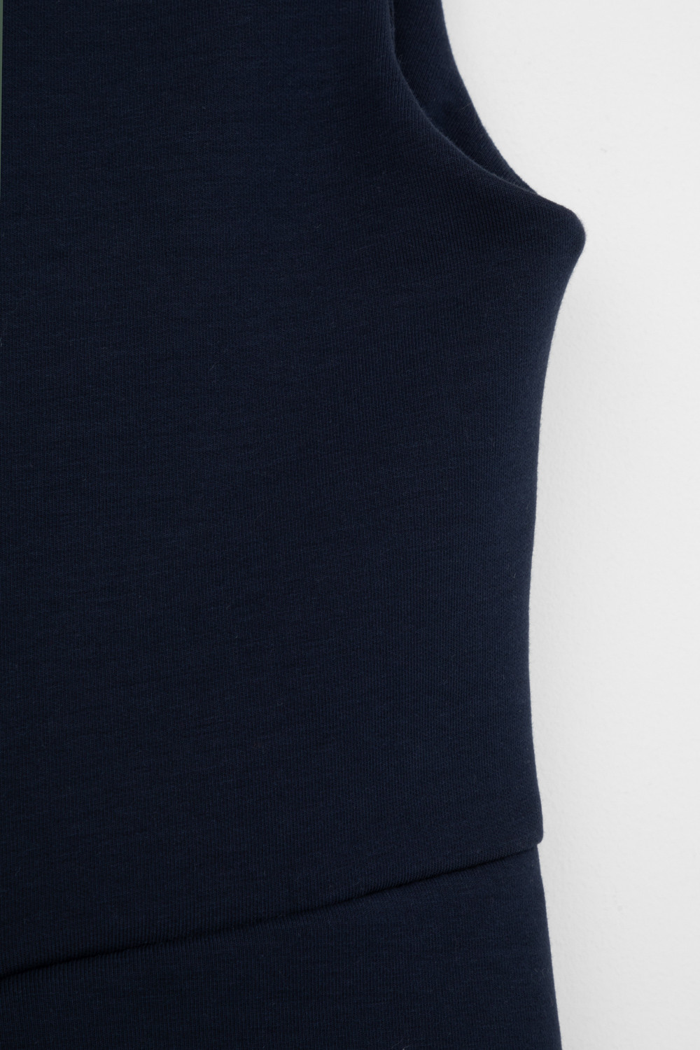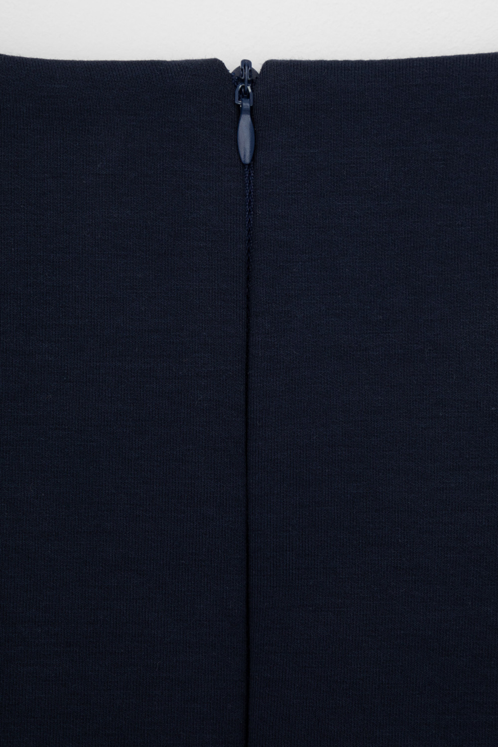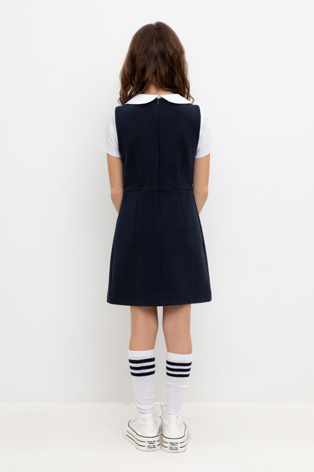 Сарафан школьный для девочки. Сшит из плотного трикотажа тёмно-синего цвета. Застёгивается на спинке на потайную молнию. Украшен широкой складкой впереди по центру.