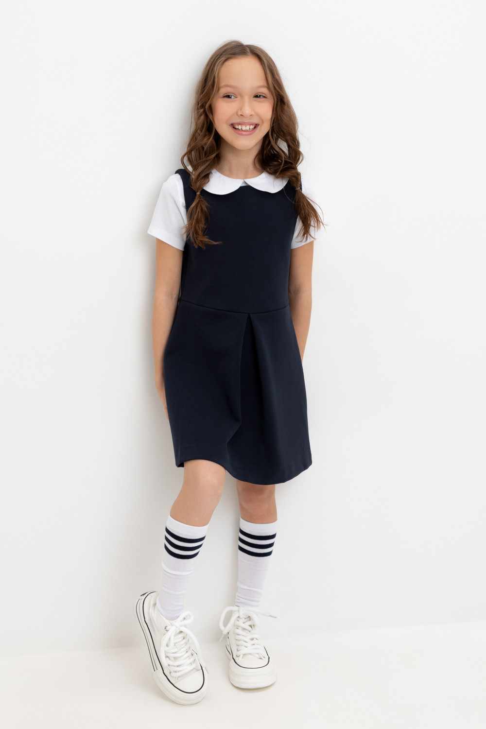Сарафан школьный для девочки. Сшит из плотного трикотажа тёмно-синего цвета. Застёгивается на спинке на потайную молнию. Украшен широкой складкой впереди по центру.