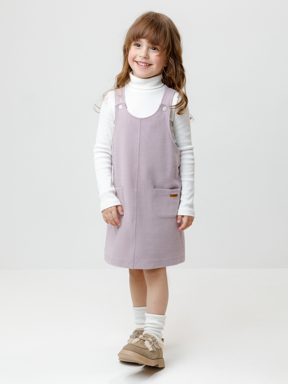Сарафан на лямках из мягкого трикотажа селаник с peach эффектом. Peach эффект достигается с помощью технологии обработки полотна, при которой на его поверхности создаётся лёгкий ворс, напоминающий нежную текстуру кожи персика. Модель с двумя накладными карманами. Лямки застегиваются на кнопки. Все трикотажные полотна производятся в соответствии с нормами швейцарского сертификата ЭкоТекс.