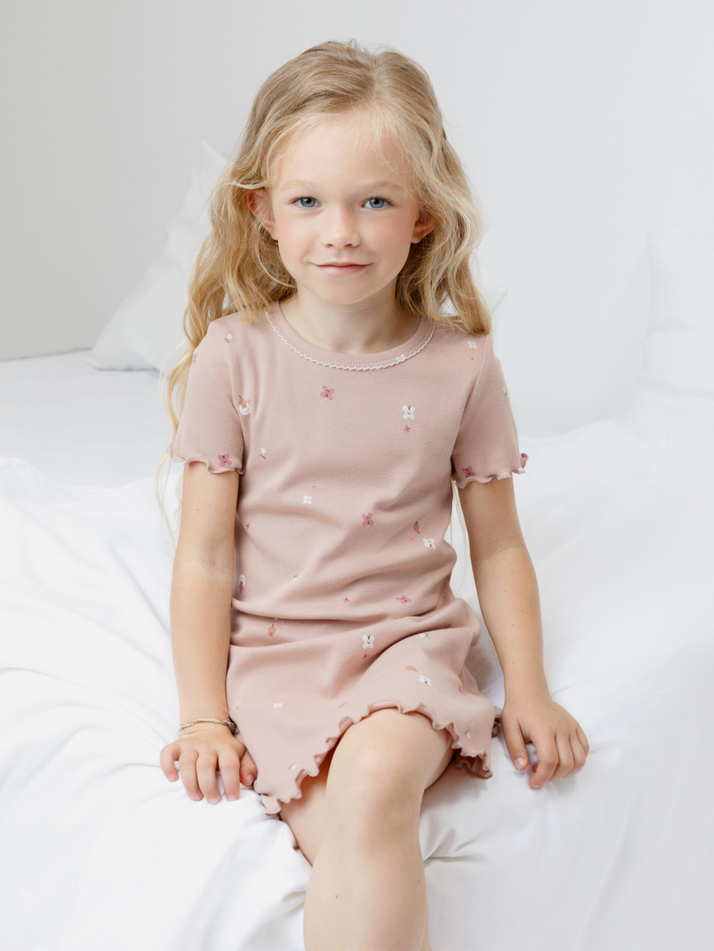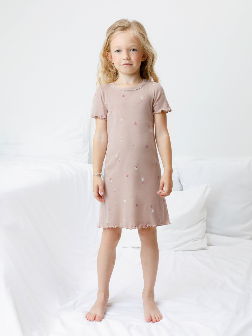 Сорочка с короткими втачными рукавами для девочки. Изготовлена из мягкого эластичного трикотажа в рубчик, произведённого из натурального хлопка. Оригинальная набивка выполнена из стойких гипоаллергенных текстильных красителей. Изделие сохраняет цвет и форму после многократных стирок. Все трикотажные полотна производятся в соответствии с нормами швейцарского сертификата ЭкоТекс.