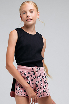 Хлопковые шорты для девочки с широким поясом на резинке. Сшиты из футера петли с набивным леопардовым рисунком. Ширина регулируется с помощью шнурка. По бокам вставки. Край обработан кантом.