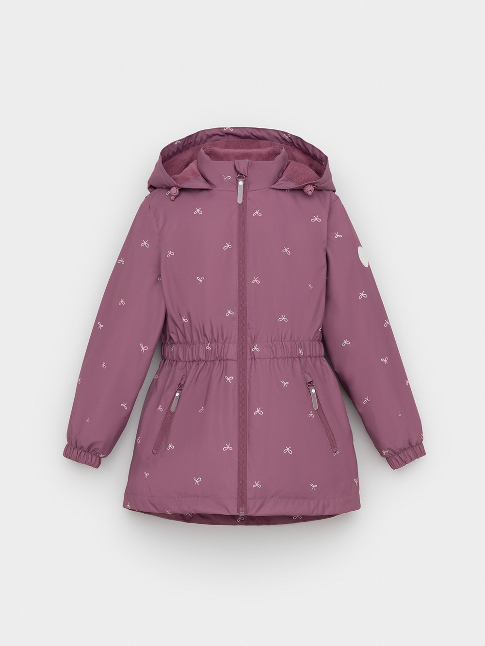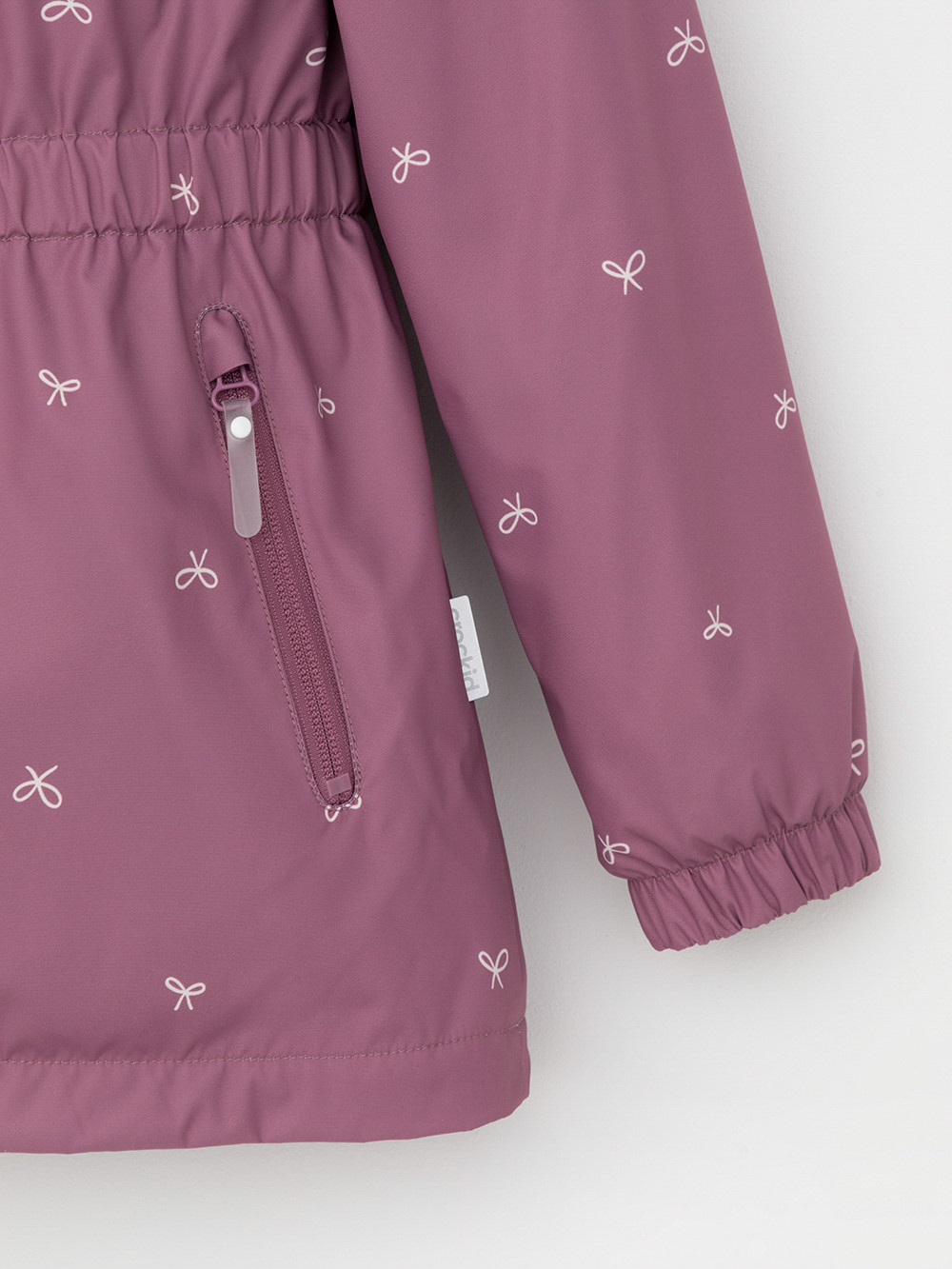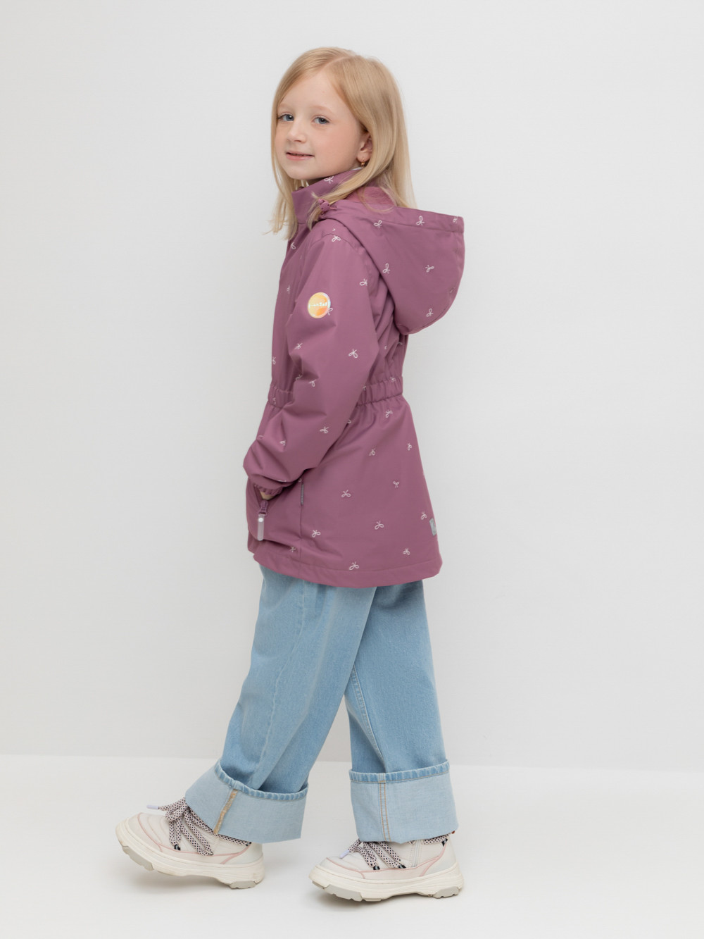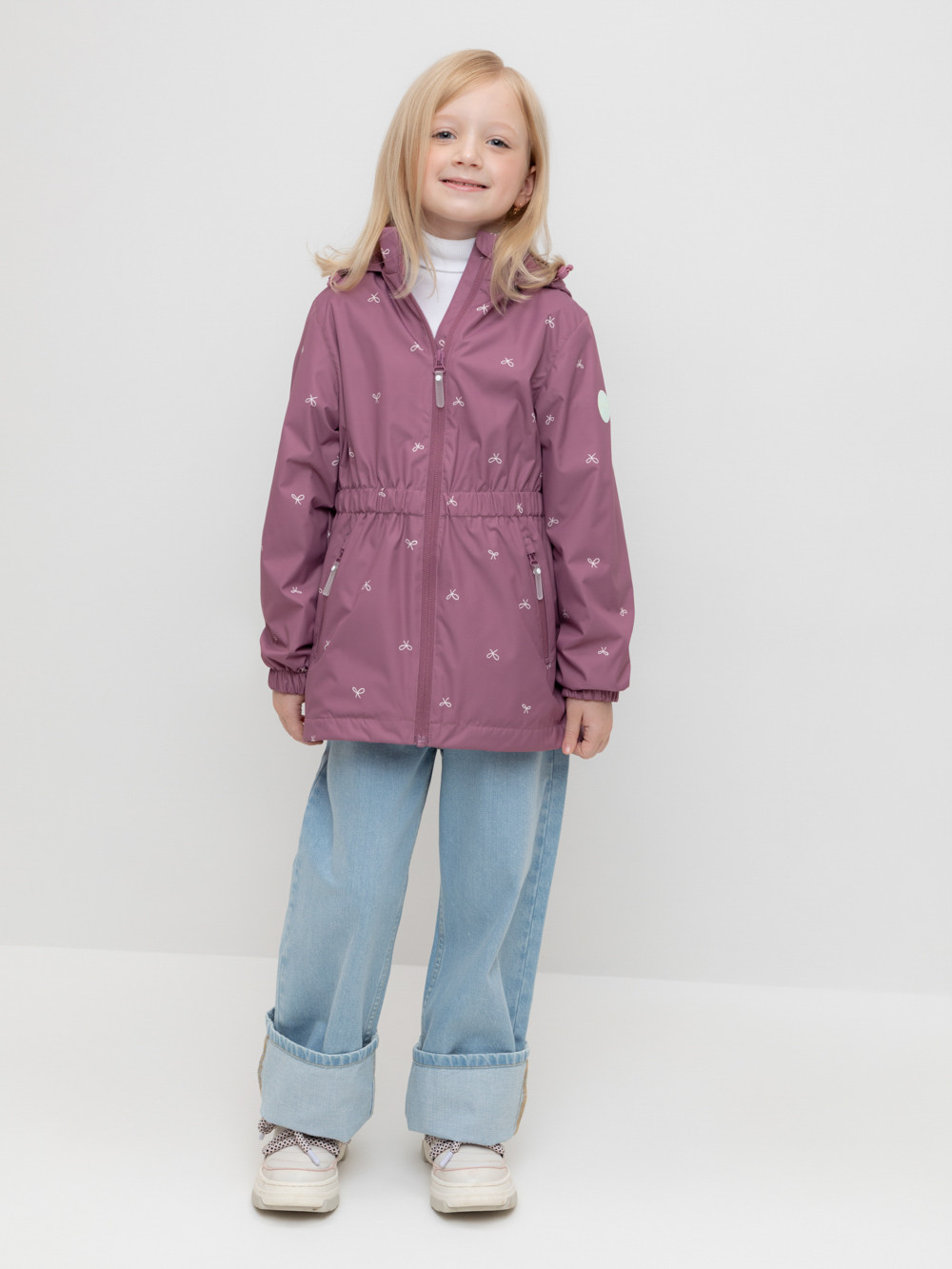 Ветровка для девочки из мембранной ткани с дополнительной тефлоновой обработкой. Верхняя мембранная ткань 1000/1000 с тефлоновым покрытием отталкивает воду и грязь и обладает «дышащими» свойствами. Подкладка выполнена из флиса, 100% полиэстер. У изделия предусмотрена защита подбородка. Несъемный капюшон регулируется с помощью эластичного шнура со стопперами. Низ рукавов и пояс изделия имеют эластичные резинки для лучшего прилегания. Во всех изделиях верхнего ассортимента для безопасности ребенка предусмотрены светоотражающие элементы.