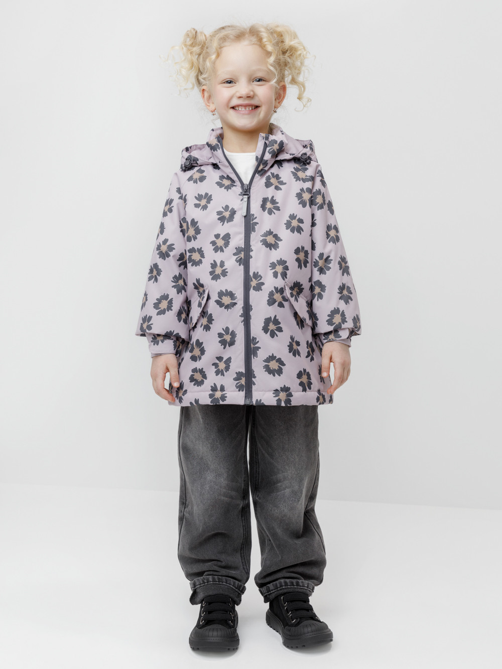 Демисезонная куртка для девочки с утеплителем Fellex®: 120 г/м2. Выполнена из мембранной ткани с тефлоновой обработкой. Данный вид обработки предохраняет изделие от загрязнения и хорошо отталкивает влагу. Подклад выполнен из 100% хлопка в размерах 86-92 и 92-98 и из 100% полиэстера в размерах от 98-104 до 122-128. Куртка застёгивается на молнию, предусмотрена защита подбородка. Несъёмный капюшон имеет эластичную утяжку со стопперами. Низ рукавов на эластичной резинке регулируется с помощью липучек для лучшего прилегания. По низу изделия эластичная утяжка со стопперами. По бокам два кармана на клапанах. Во всех изделиях верхнего ассортимента для безопасности ребёнка предусмотрены светоотражающие элементы.