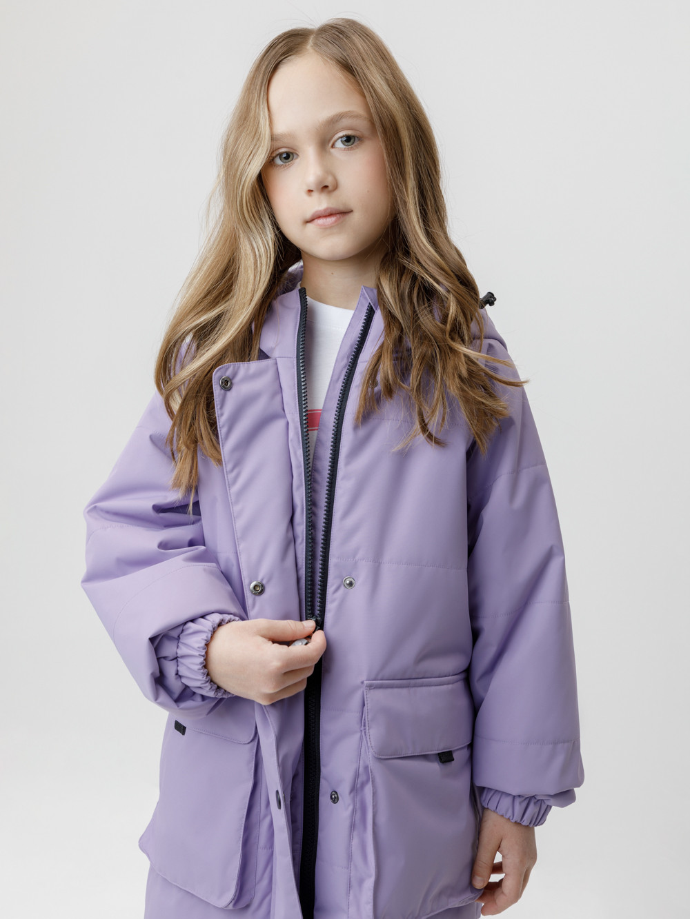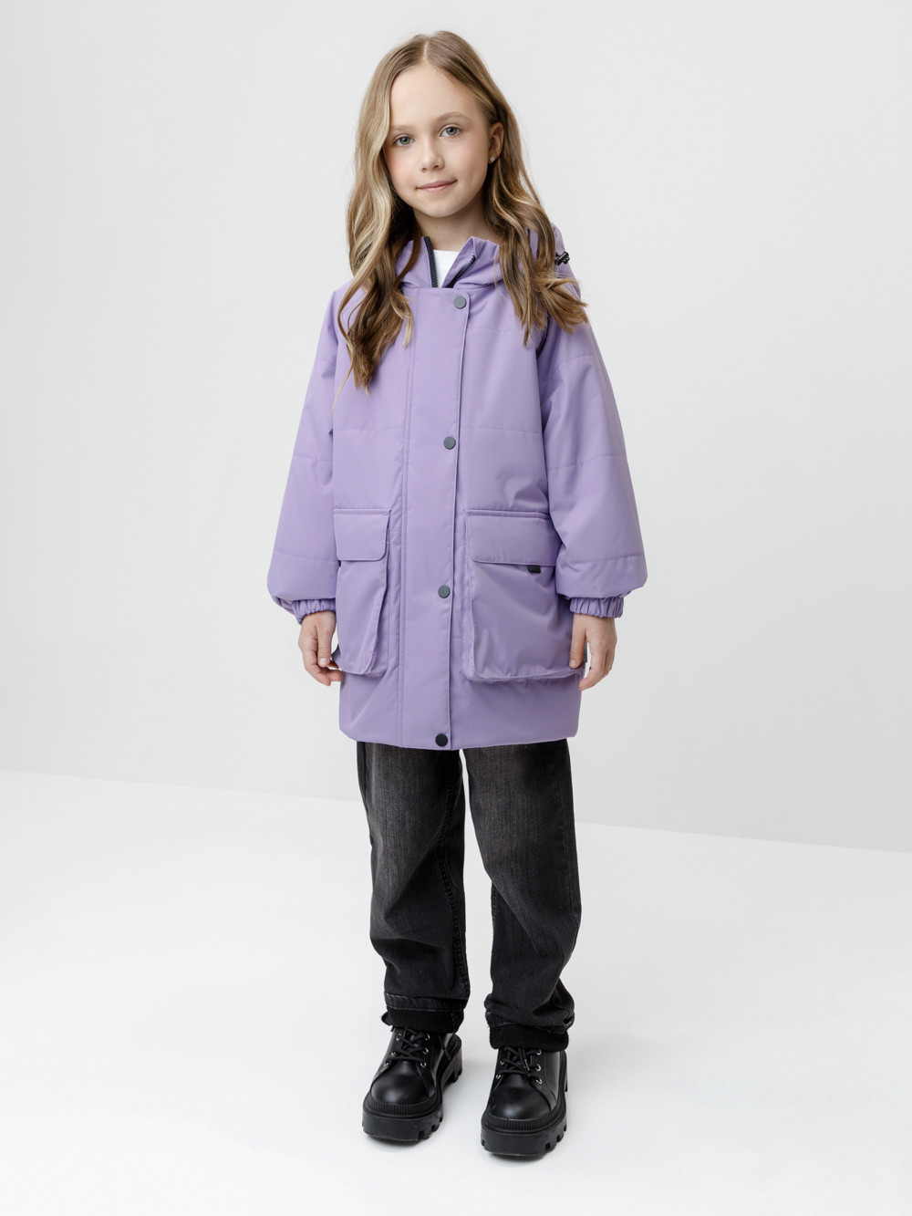 Демисезонная куртка для девочки с утеплителем Fellex®: 120 г/м2. Выполнена из мембранной ткани с тефлоновой обработкой. Данный вид обработки предохраняет изделие от загрязнения и хорошо отталкивает влагу. Подклад выполнен из 100% полиэстера. Куртка застёгивается на молнию и дополнительно защищена внешней ветрозащитной планкой на липучках. Предусмотрена защита подбородка. Несъёмный капюшон имеет эластичную утяжку со стопперами. Низ рукавов на эластичной резинке для лучшего прилегания. По бокам два кармана на клапанах. Во всех изделиях верхнего ассортимента для безопасности ребёнка предусмотрены светоотражающие элементы.