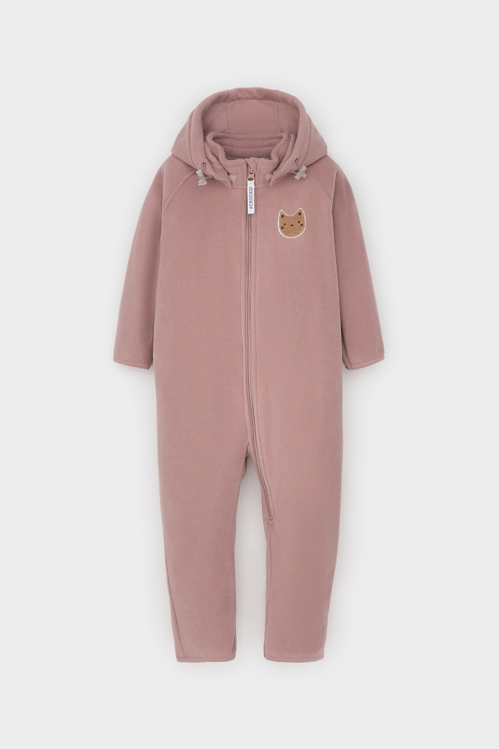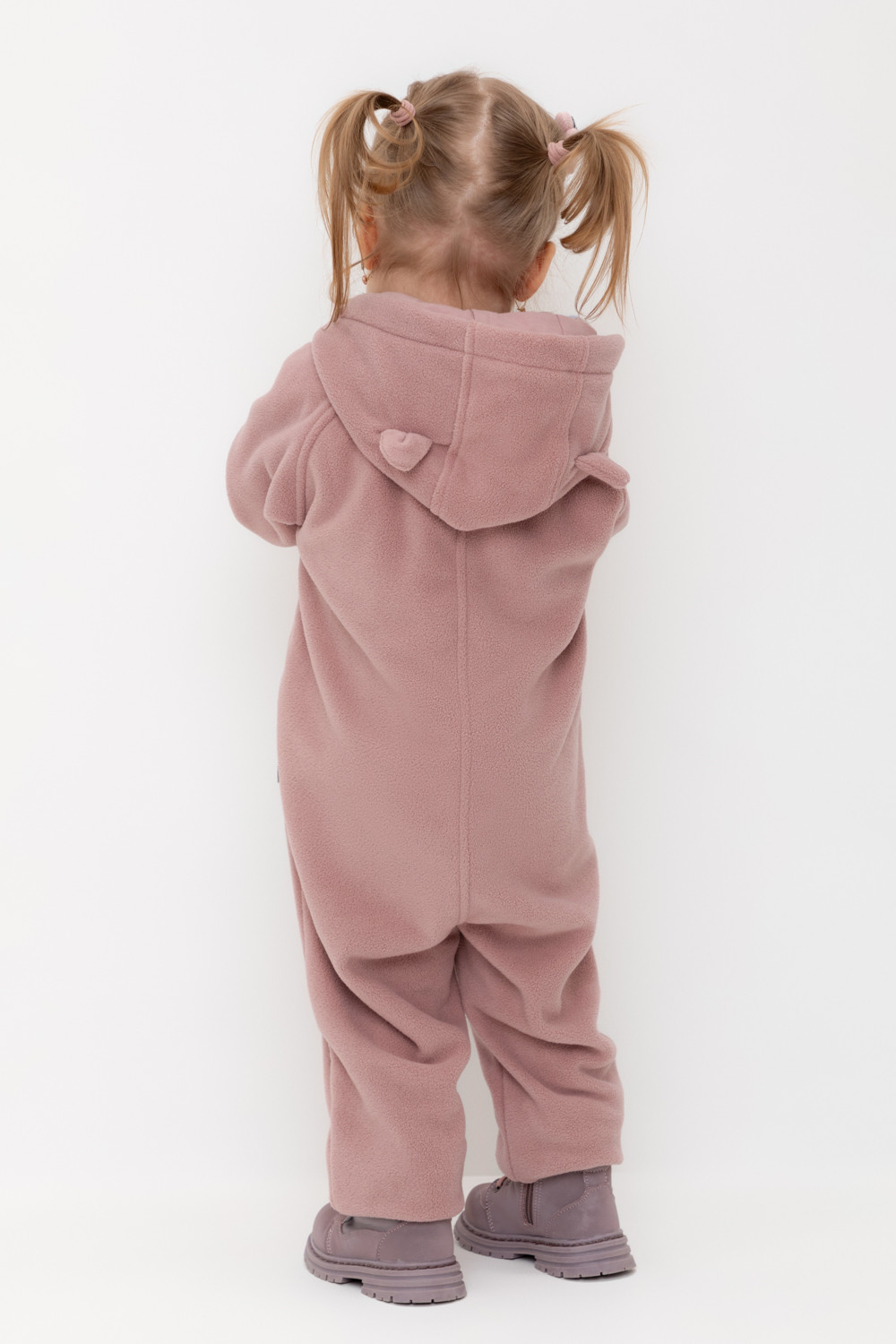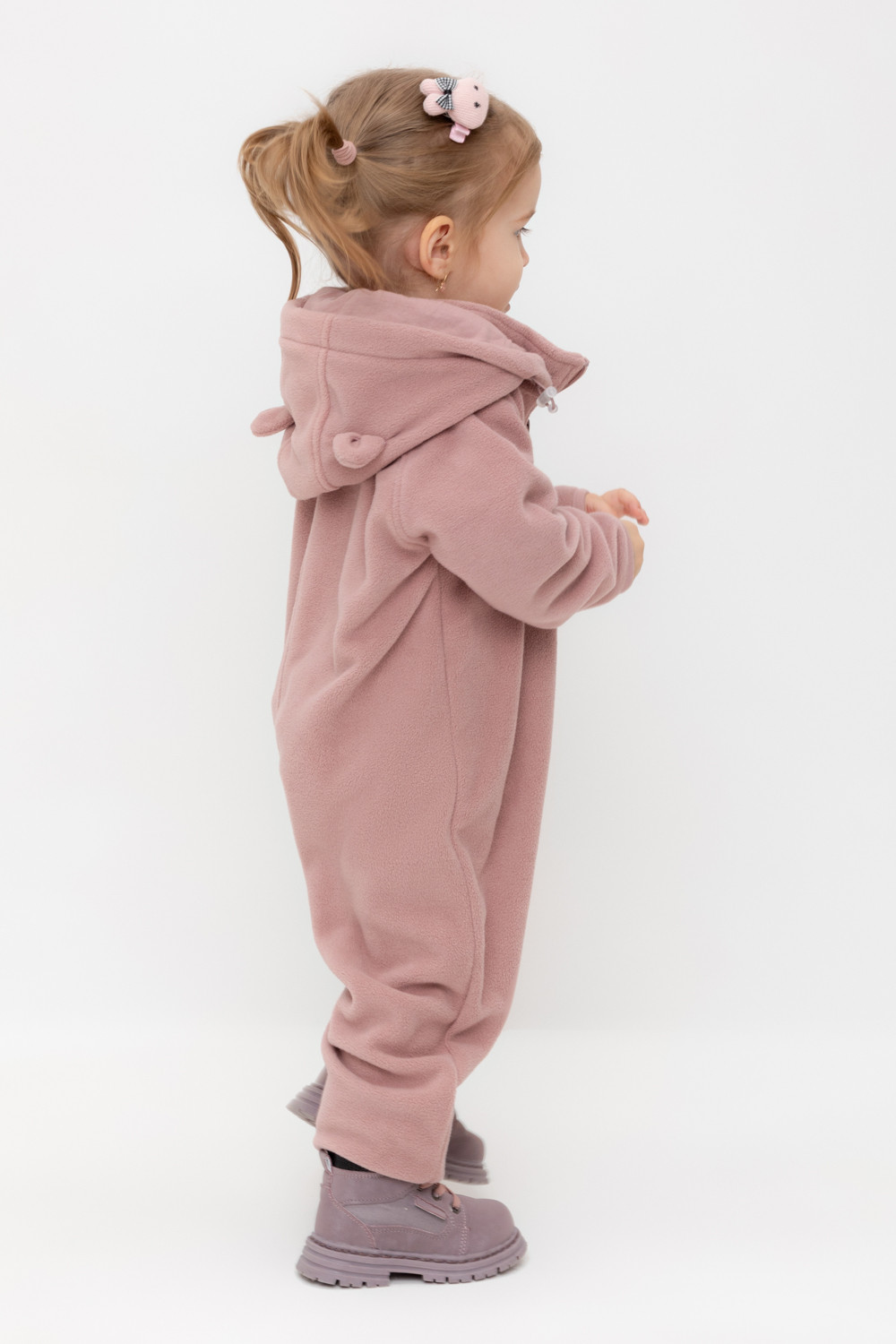 Флисовый комбинезон со съёмным капюшоном для девочки. У изделия высокий воротник и съёмный капюшон на кнопках. Застёгивается на удлинённую молнию. Предусмотрена защита шеи и подбородка. В размерах 40/62 - 48/74 на рукавах и штанинах есть удобные отвороты. Комбинезон сохраняет цвет и форму после многократных стирок.