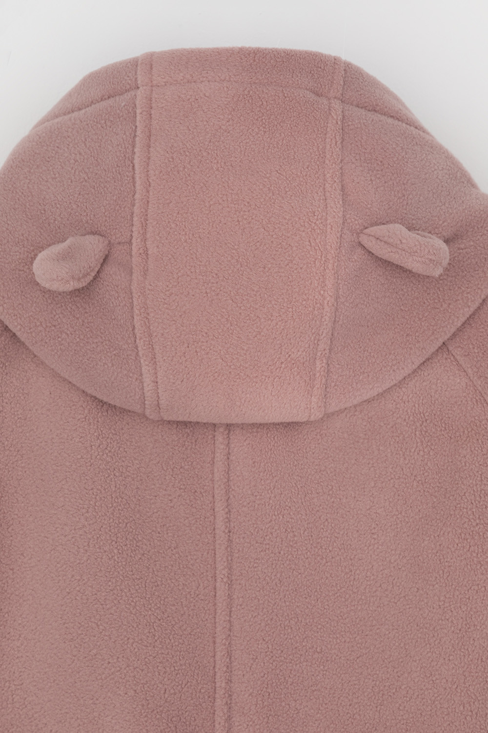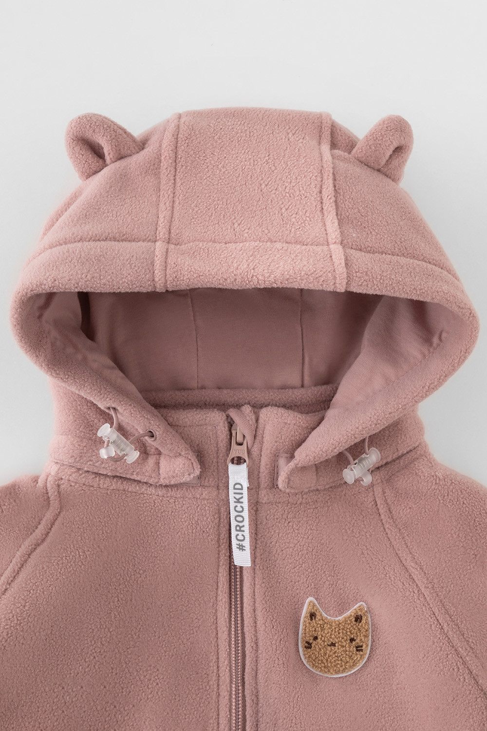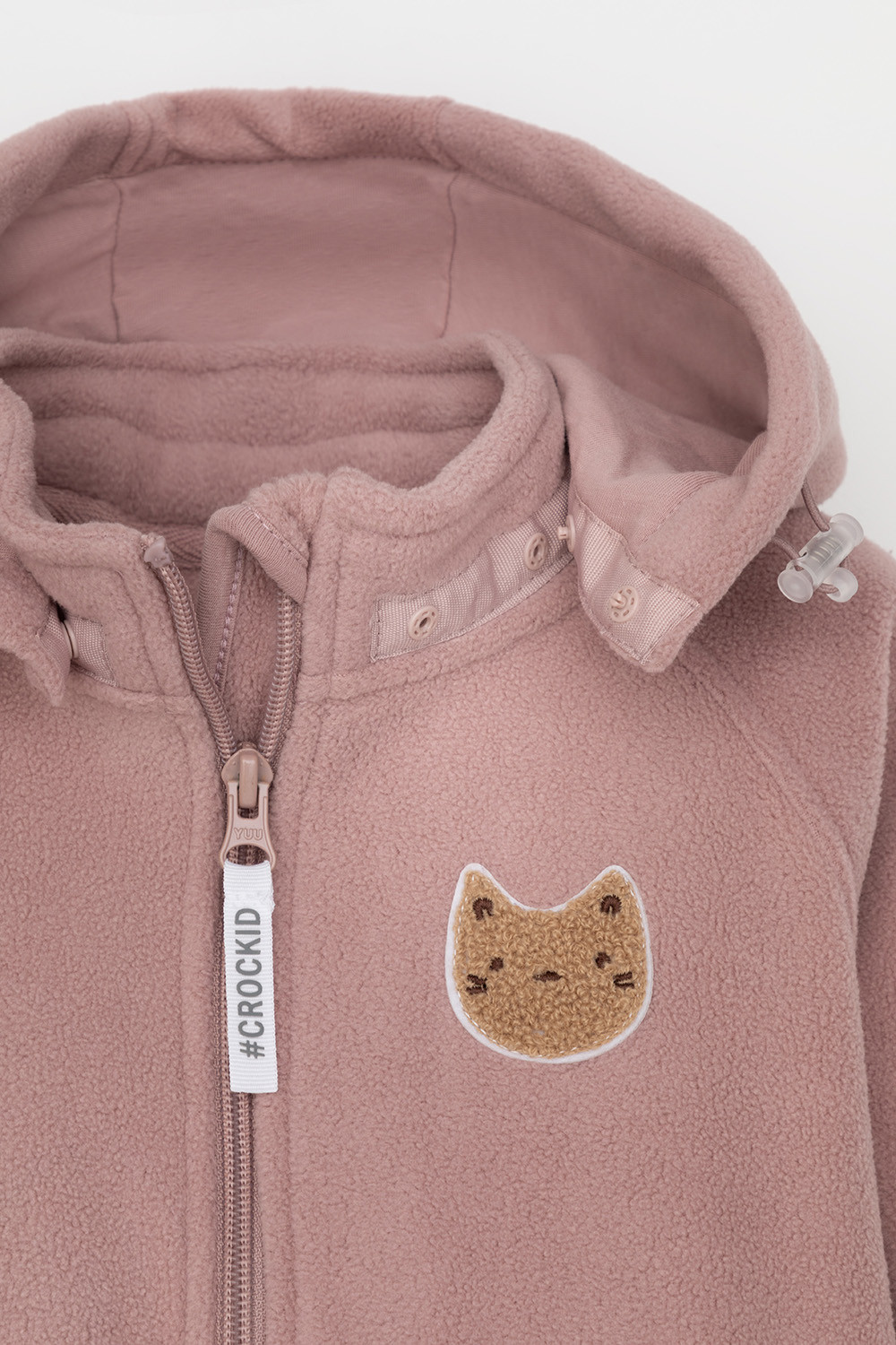 Флисовый комбинезон со съёмным капюшоном для девочки. У изделия высокий воротник и съёмный капюшон на кнопках. Застёгивается на удлинённую молнию. Предусмотрена защита шеи и подбородка. В размерах 40/62 - 48/74 на рукавах и штанинах есть удобные отвороты. Комбинезон сохраняет цвет и форму после многократных стирок.