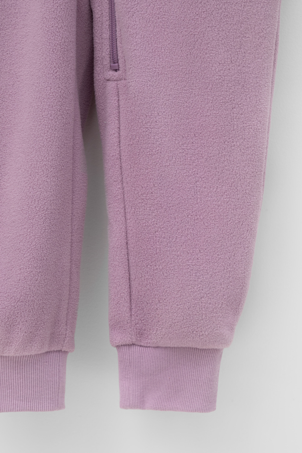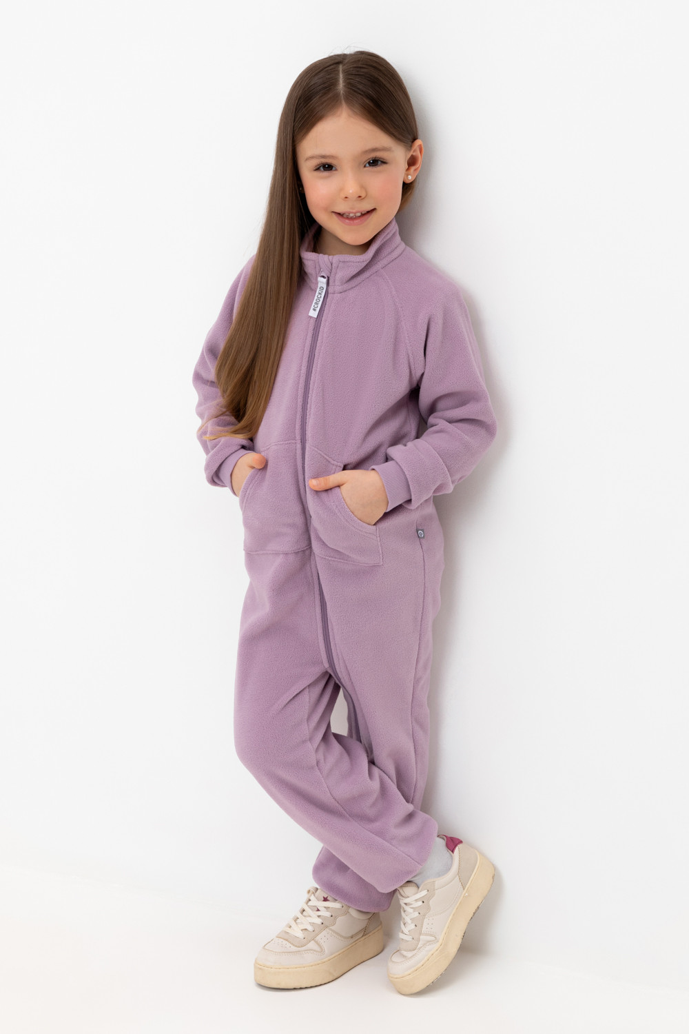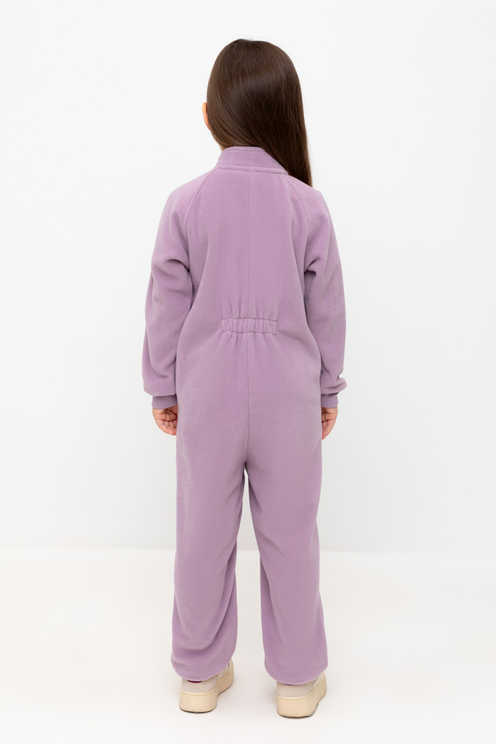 Однотонный флисовый комбинезон для девочки с высоким воротником. Застёгивается на удлинённую молнию с мягкой защитой шеи и подбородка. Рукава и низ изделия на манжетах из трикотажа в рубчик. Эластичная резинка по спинке обеспечивает идеальную посадку. Спереди удобный карман-кенгуру. Комбинезон сохраняет цвет и форму после многократных стирок.