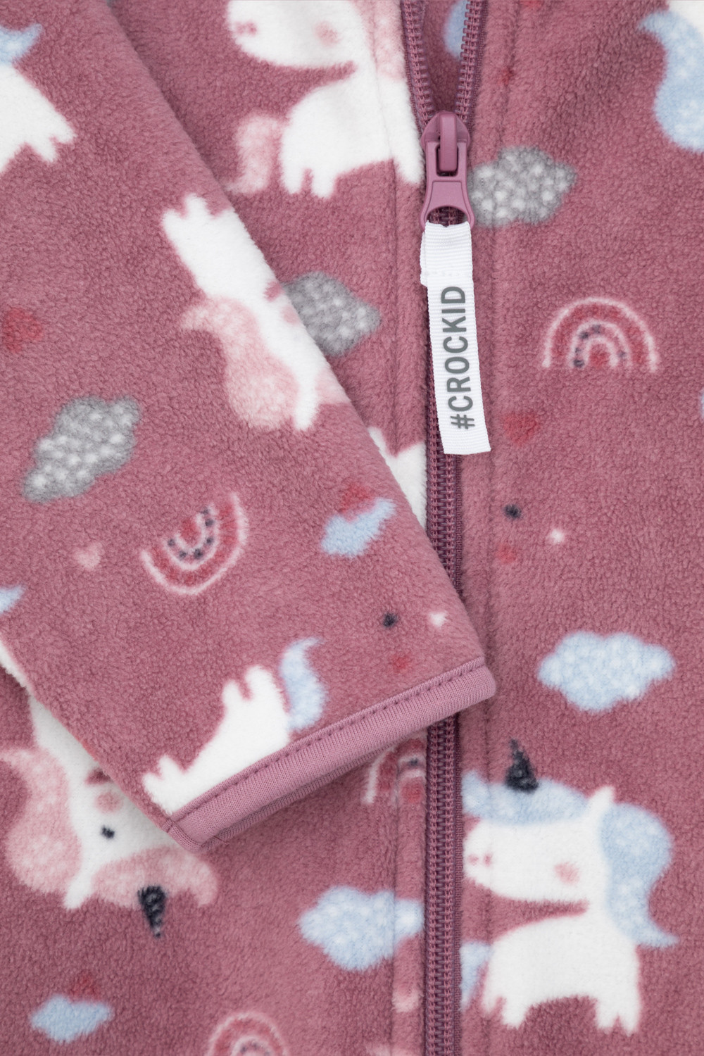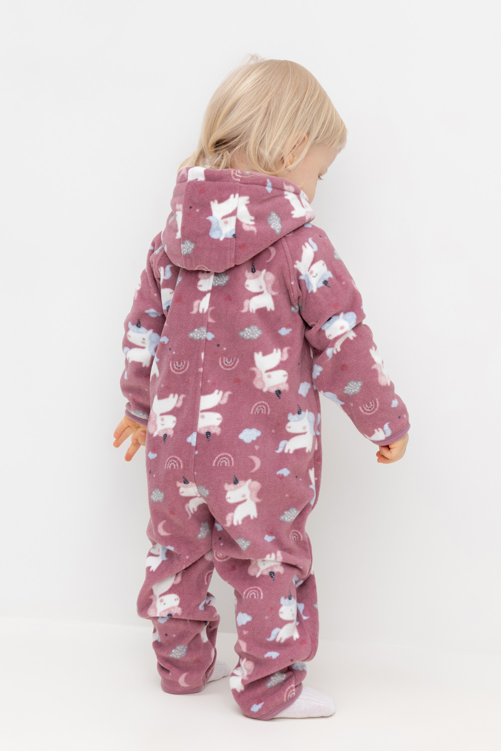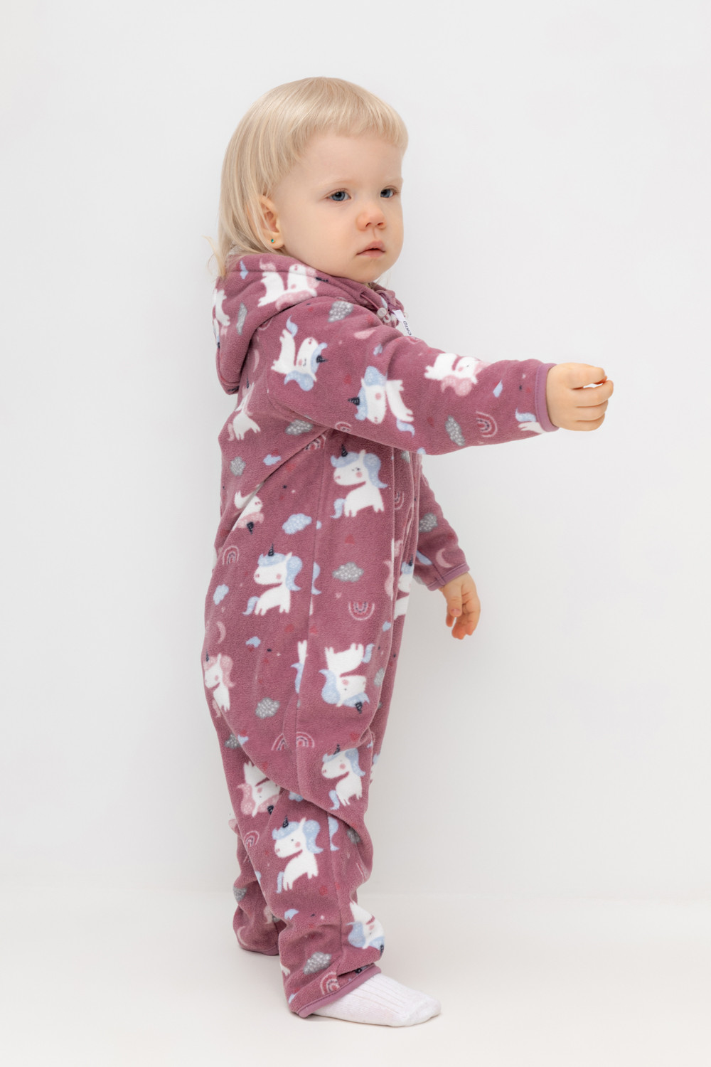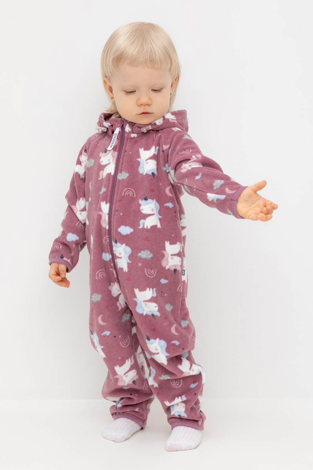 Флисовый комбинезон со съёмным капюшоном для девочки. У изделия высокий воротник и съёмный капюшон на кнопках с подкладом из супрема. Застёгивается на удлинённую молнию. Предусмотрена защита шеи и подбородка. В размерах 40/62 - 48/74 на рукавах и штанинах есть удобные отвороты. Оригинальная набивка выполнена из стойких, гипоаллергенных текстильных красителей. Комбинезон сохраняет цвет и форму после многократных стирок.