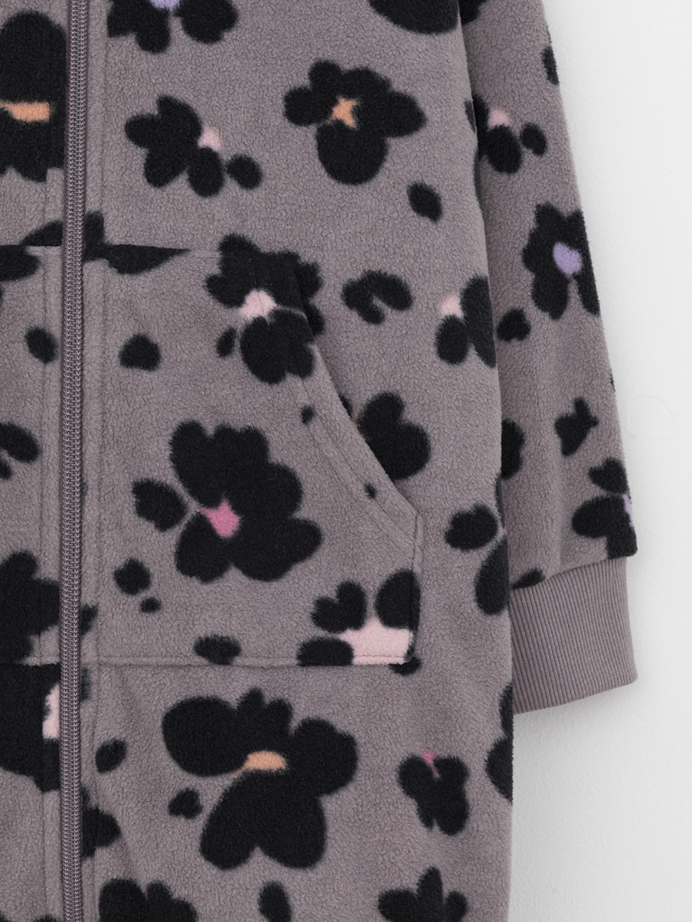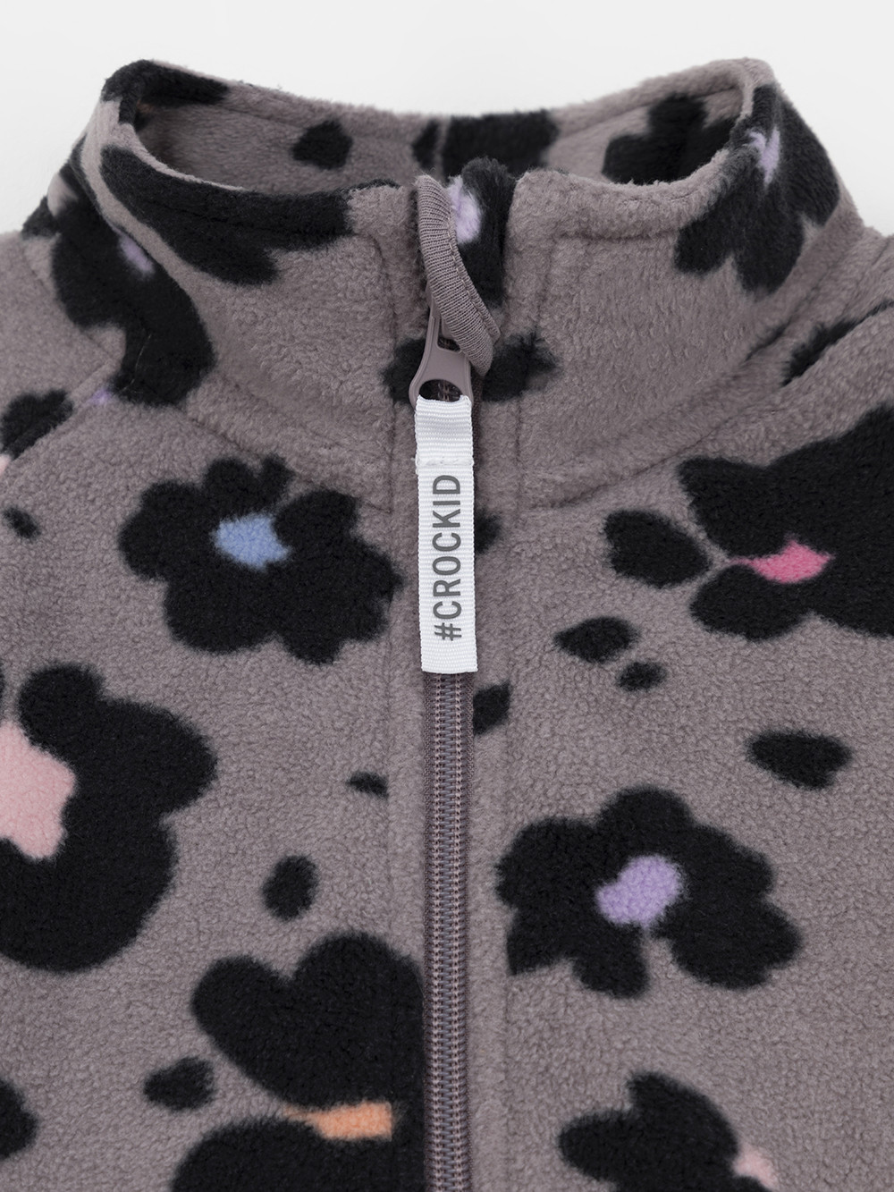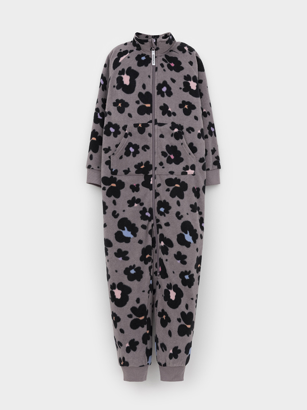 Флисовый комбинезон для девочки с высоким воротником. Застёгивается на удлинённую молнию с мягкой защитой шеи и подбородка. Рукава и низ изделия на манжетах из  трикотажа в рубчик. Эластичная резинка по спинке обеспечивает идеальную посадку. Спереди удобный карман-кенгуру. Оригинальная набивка выполнена из стойких гипоаллергенных текстильных красителей. Комбинезон сохраняет цвет и форму после многократных стирок.