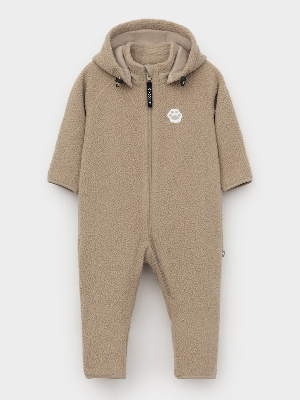 Флисовый комбинезон для девочки со съёмным капюшоном. Капюшон регулируется по ширине с помощью эластичной утяжки со стопперами. Подклад выполнен из гладкого трикотажа супрем, произведённого из высококачественного натурального хлопка. Застёгивается на удлинённую молнию с мягкой защитой шеи и подбородка. В размерах 62, 68 и 74 на рукавах и ножках есть отвороты. Украшен декоративными ушками и нашивкой. Комбинезон сохраняет цвет и форму после многократных стирок.
