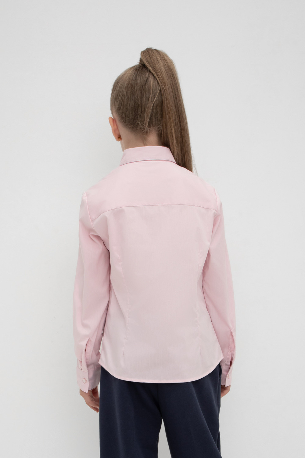 Классическая блузка для девочки с отложным воротником. Застегивается спереди на планку с пуговицами. Длинные втачанные рукава с манжетами регулируются по ширине.