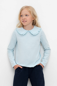 Блузка школьная для девочки с отложным воротником из  трикотажа супрем. Застёгивается на пуговицу и петельку из шляпной резины. Воротник украшен оборкой. Рукава и низ изделия обработаны плоскими швами.