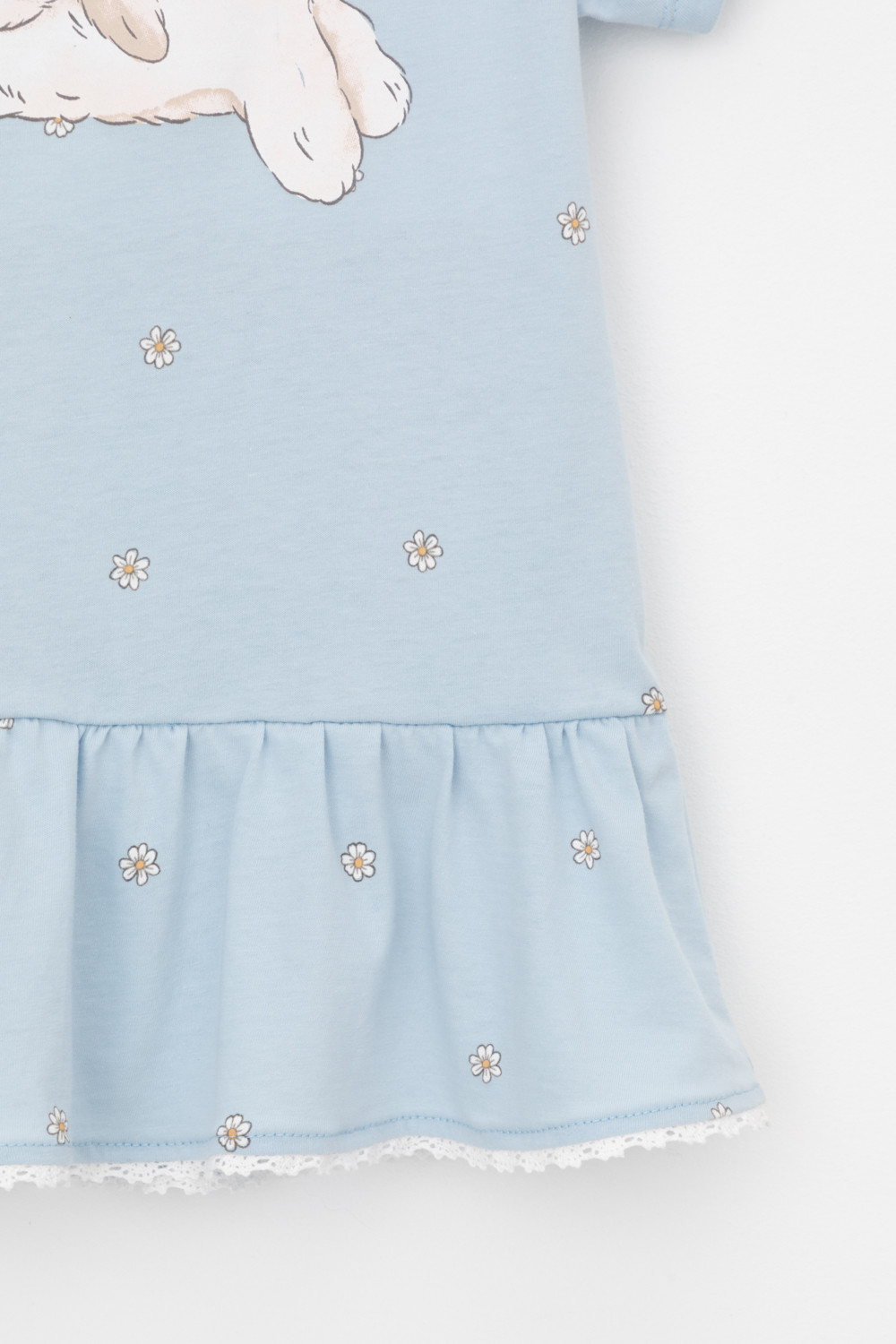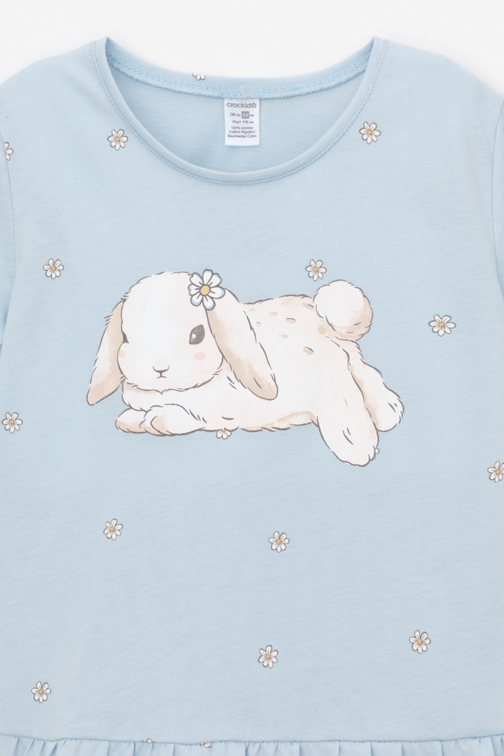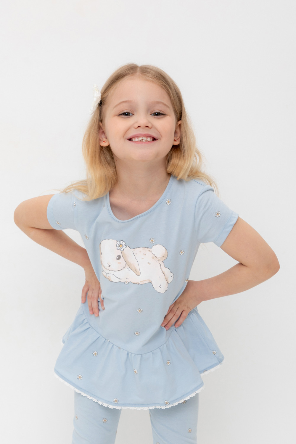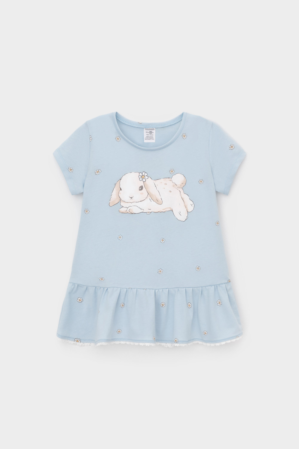 Легкая трикотажная туника для девочки из высококачественного хлопка. По низу украшена кружевом. Застёжка на плече в размерах 92 и 98. Оригинальная набивка и принт выполнены из стойких текстильных гипоаллергенных красителей. Изделие сохраняет цвет и форму после многократных стирок.