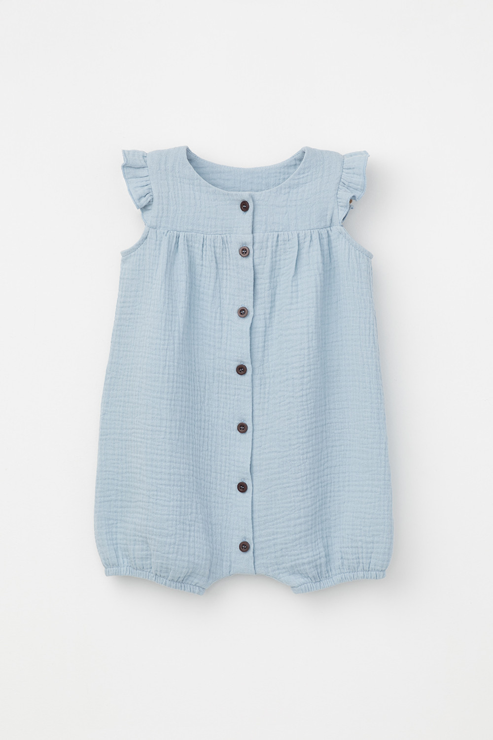Легкий песочник для девочки из мягкого хлопокового муслина с застежкой на пуговицы. Изделие сохраняет цвет, форму и фактуру жатости после многократных стирок.