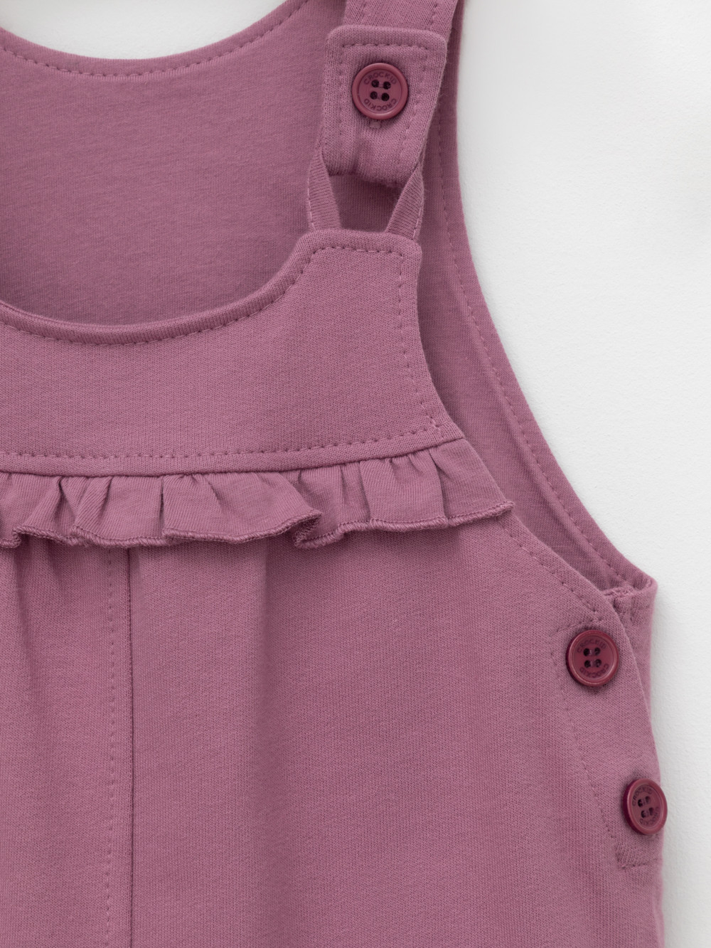 Полукомбинезон с лямками из мягкого петельчатого футера для девочки. Застёгивается на пуговицы. В размерах 74 и 80 предусмотрена пошаговая застёжка на кнопки. Низ на манжетах. Изделие сохраняет цвет и форму после многократных стирок. Все трикотажные полотна производятся в соответствии с нормами швейцарского сертификата ЭкоТекс.