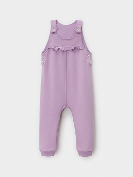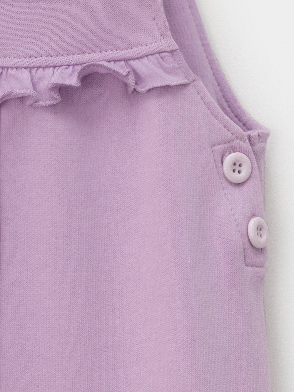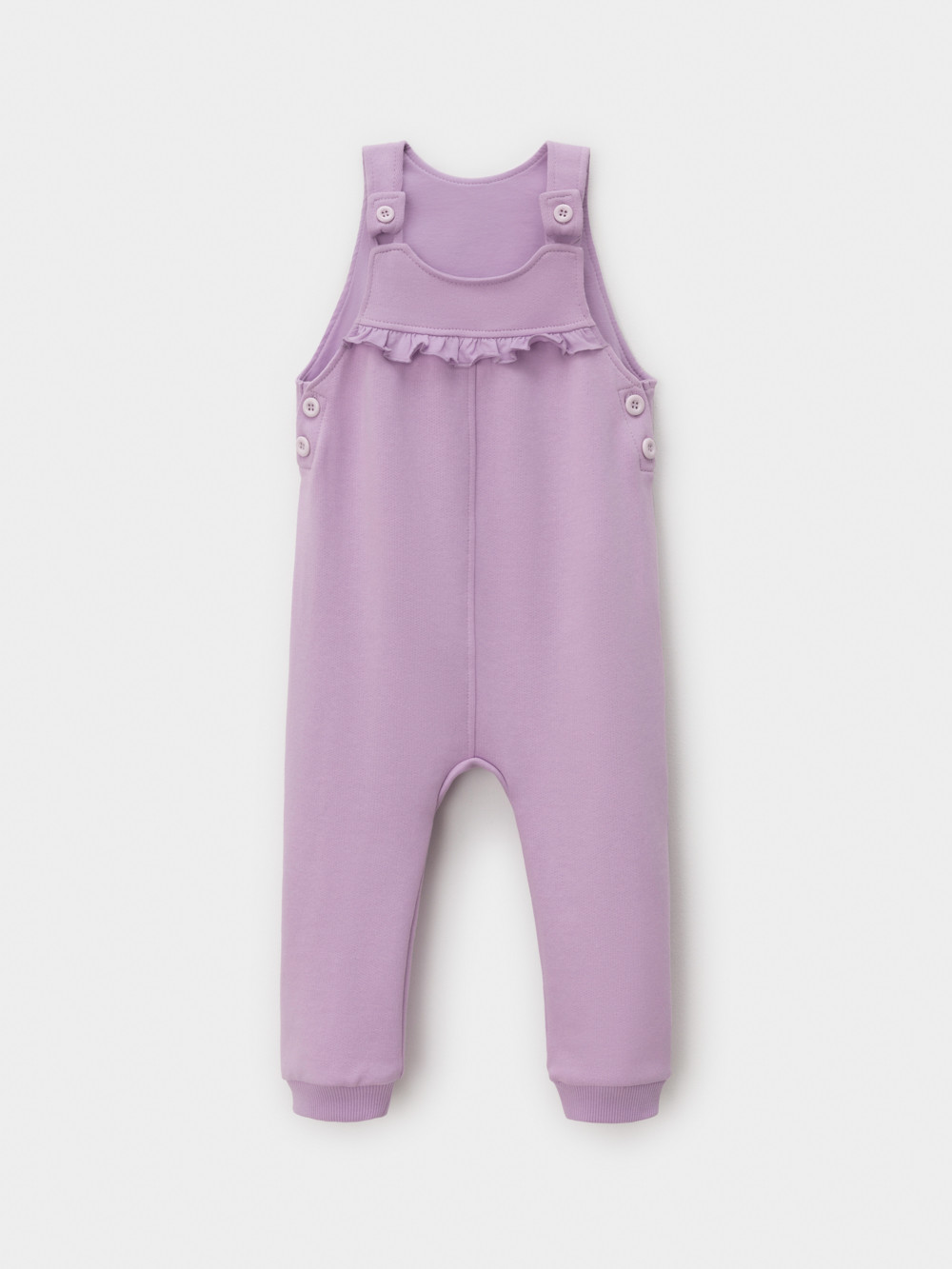 Полукомбинезон на лямках из мягкого петельчатого футера для девочки. Застёгивается на пуговицы. В размерах 74 и 80 предусмотрена пошаговая застёжка на кнопки. Низ на манжетах. Изделие сохраняет цвет и форму после многократных стирок. Все трикотажные полотна производятся в соответствии с нормами швейцарского сертификата ЭкоТекс.