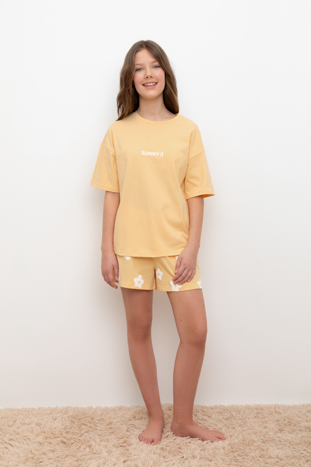Трикотажный пижамный комплект из натурального хлопка. У футболки короткие рукава со спущенными плечами. Шорты с поясом на резинке. Оригинальная набивка выполнена из стойких, гипоаллергенных текстильных красителей. Все трикотажные полотна производятся в соответствии с нормами Швейцарского сертификата ЭкоТекс.