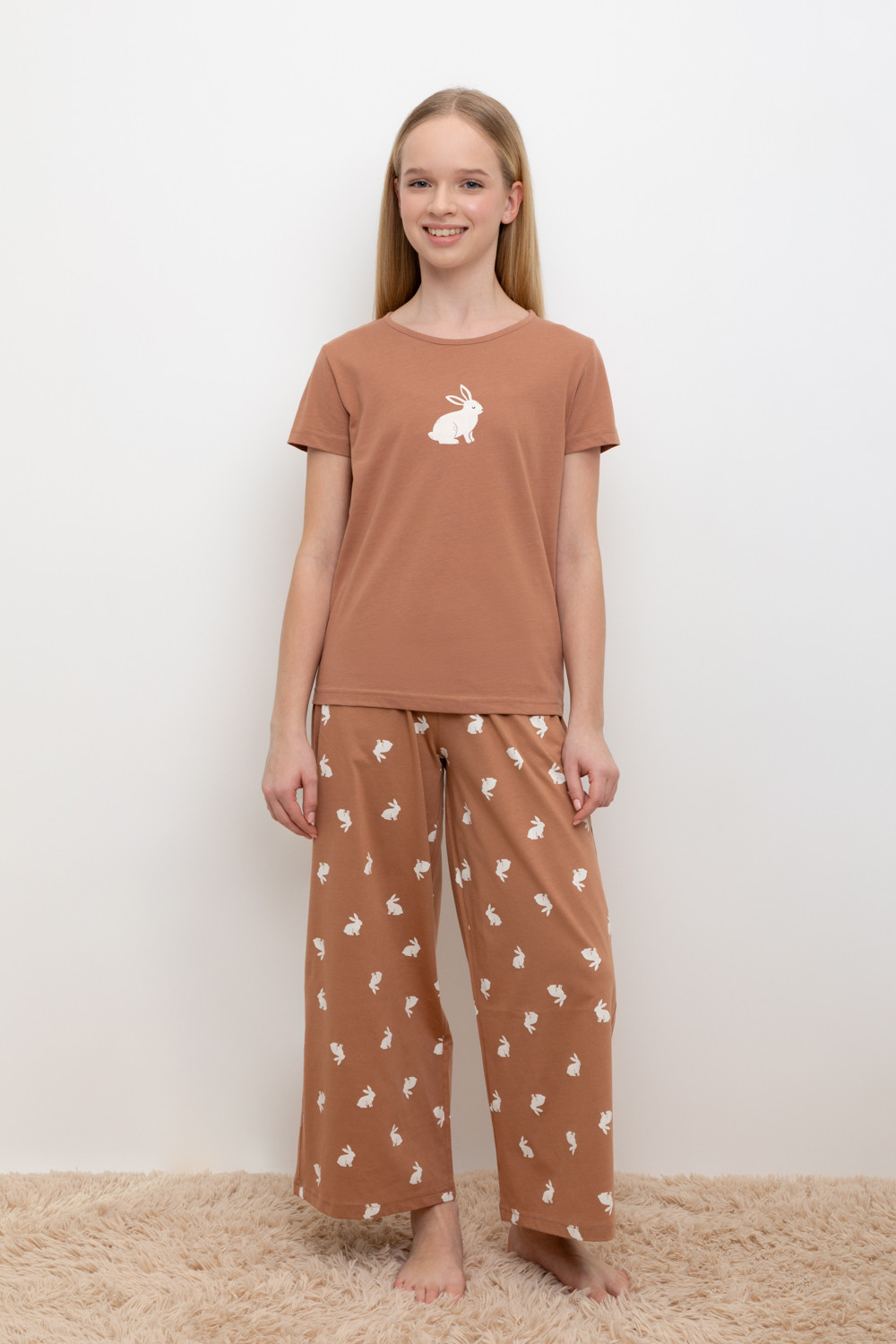 Трикотажный пижамный комплект из натурального хлопка. В комплекте футболка с короткими рукавами и  со спущенными плечами. Укороченные брюки с удобным поясом на резинке. Оригинальная набивка и принт выполнены из стойких, гипоаллергенных текстильных красителей. Все трикотажные полотна производятся в соответствии с нормами Швейцарского сертификата ЭкоТекс.