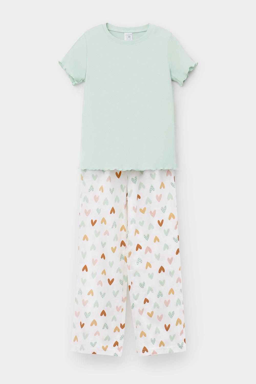 Трикотажная пижама из натурального хлопка. Футболка с короткими втачными рукавами изготовлена из эластичного трикотажа в рубчик. Брюки с эластичной резинкой в поясе выполнены из гладкого трикотажа супрем. Оригинальная набивка выполнена из стойких текстильных гипоаллергенных красителей. Изделие сохраняет цвет и форму после многократных стирок. Все трикотажные полотна производятся в соответствии с нормами швейцарского сертификата ЭкоТекс.