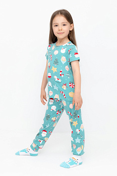 Трикотажная пижама из натурального хлопка. Футболка с короткими рукавами. У брюк в комплекте мягкий, эластичный пояс на резинке. Оригинальные набивка выполнена из стойких, гипоаллергенных текстильных красителей. Комплект сохраняет цвет и форму после многократных стирок. Все трикотажные полотна производятся в соответсвии с нормами Швейцарского сертификата ЭкоТекс.