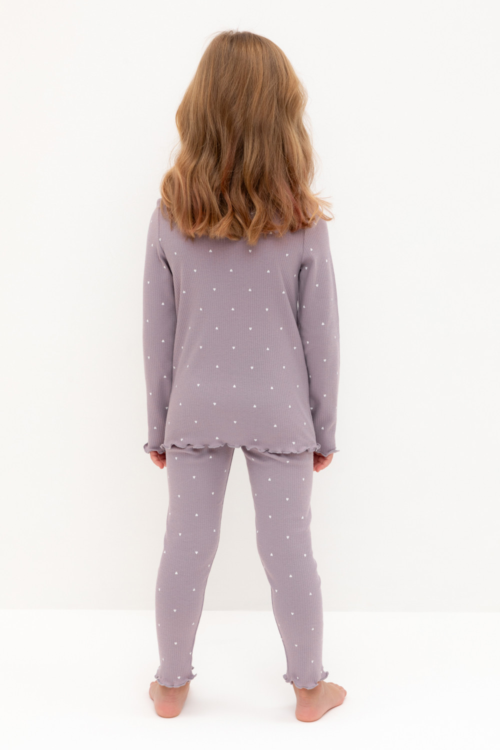 Трикотажная пижама в рубчик из натурального хлопка. Джемпер с длинными втачными рукавами и лосины с эластичной резинкой в поясе. Оригинальная набивка выполнена из стойких текстильных гипоаллергенных красителей. Изделие сохраняет цвет и форму после многократных стирок. Все трикотажные полотна производятся в соответствии с нормами швейцарского сертификата ЭкоТекс.