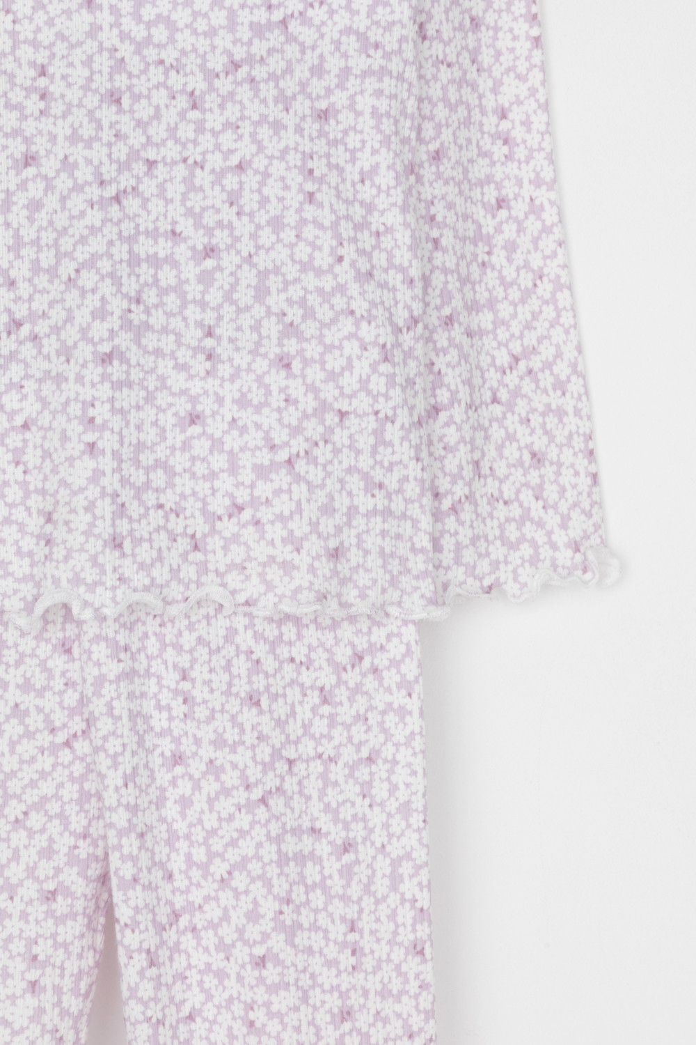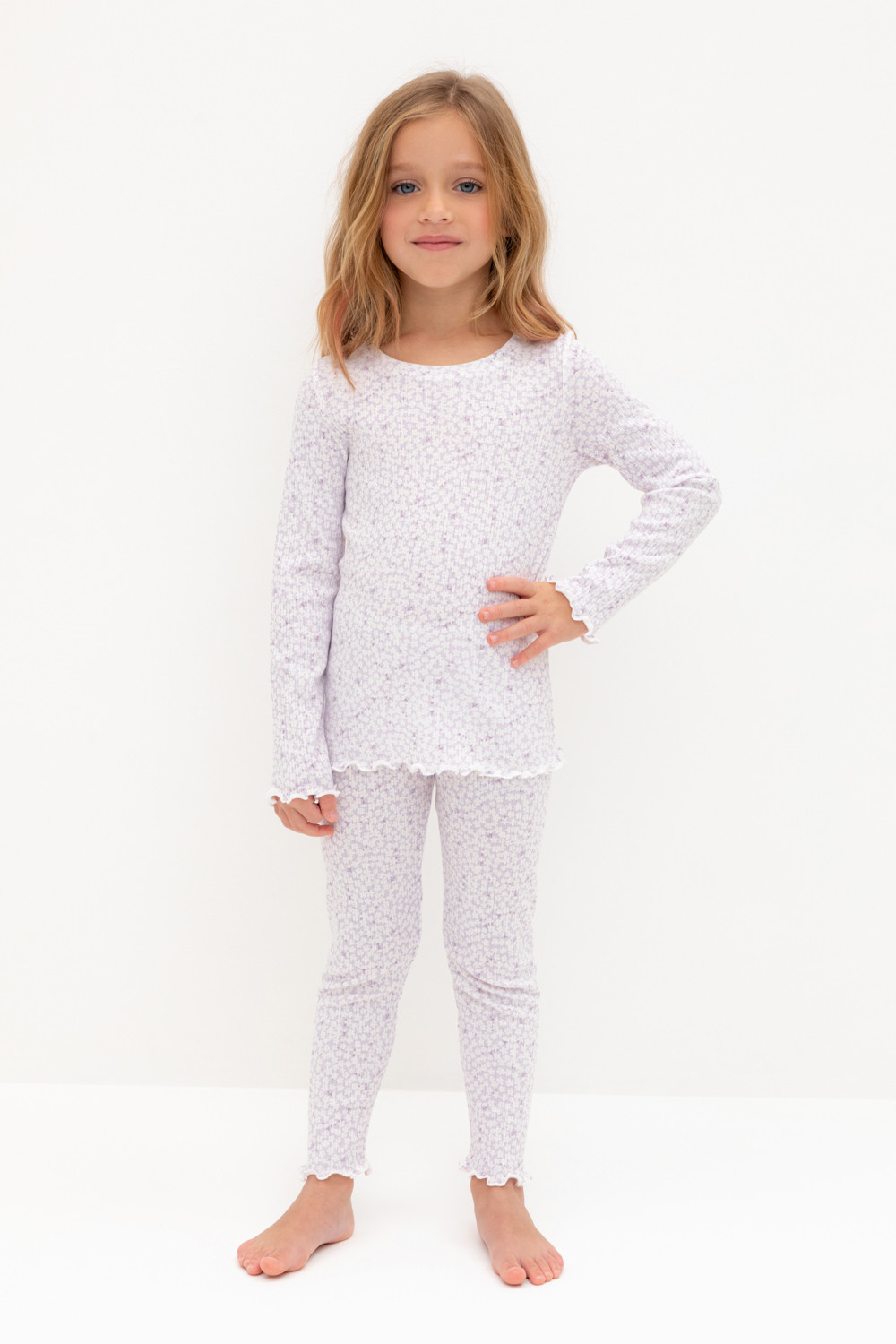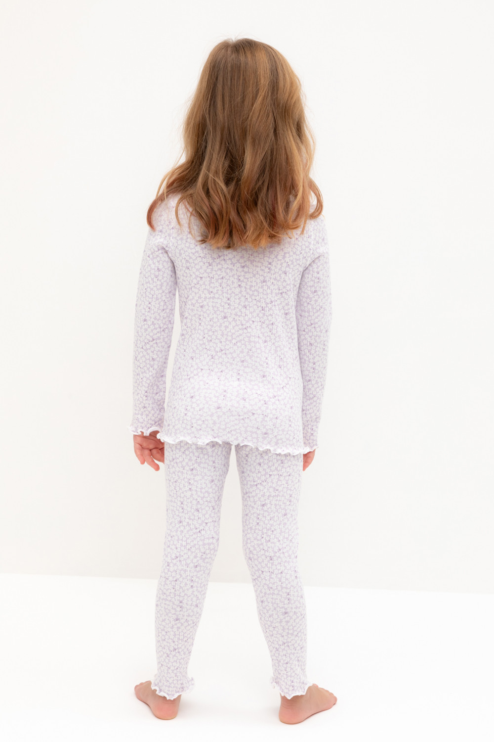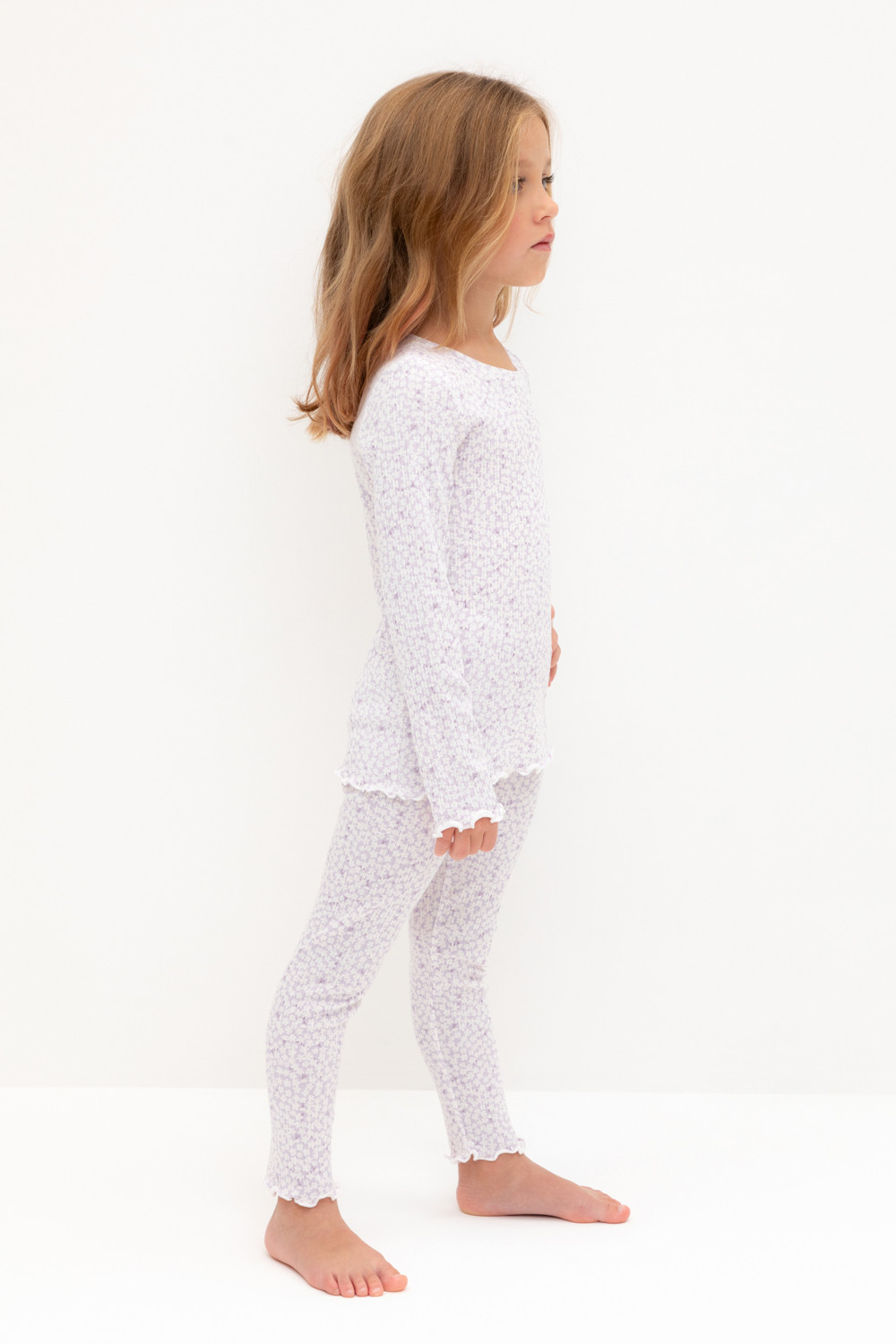 Трикотажная пижама в рубчик из натурального хлопка. Джемпер с длинными втачными рукавами и лосины с эластичной резинкой в поясе. Оригинальная набивка выполнена из стойких текстильных гипоаллергенных красителей. Изделие сохраняет цвет и форму после многократных стирок. Все трикотажные полотна производятся в соответсвии с нормами швейцарского сертификата ЭкоТекс.