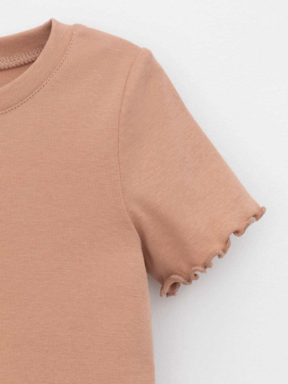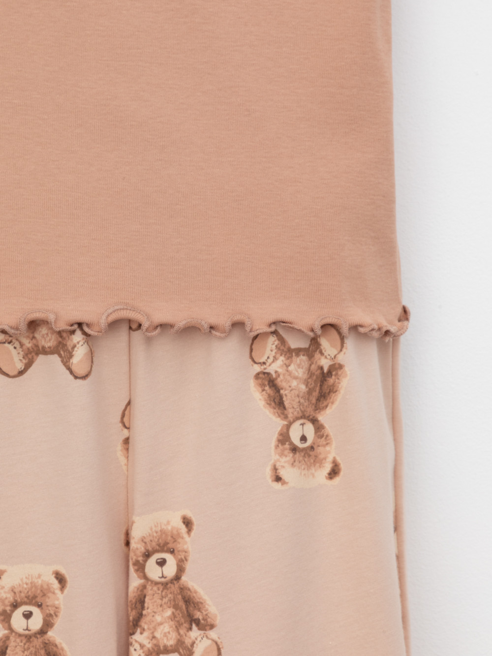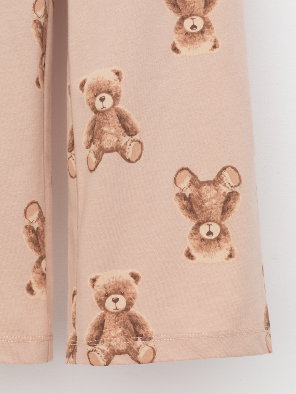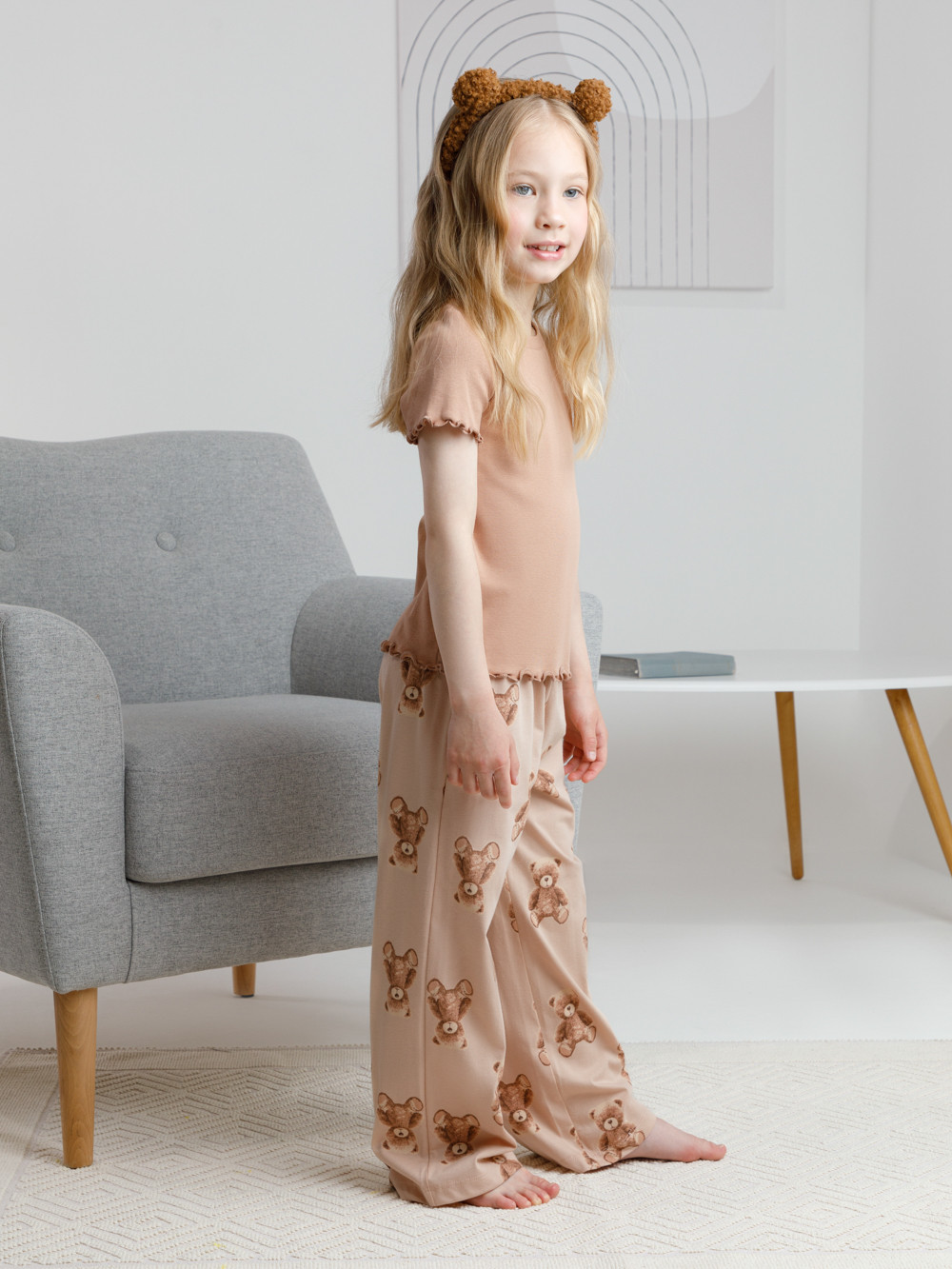 Трикотажная пижама из натурального хлопка. Футболка с короткими втачными рукавами изготовлена из эластичного трикотажа в рубчик. Брюки с эластичной резинкой в поясе выполнены из гладкого трикотажа супрем. Оригинальная набивка выполнена из стойких текстильных гипоаллергенных красителей. Изделие сохраняет цвет и форму после многократных стирок. Все трикотажные полотна производятся в соответствии с нормами швейцарского сертификата ЭкоТекс.