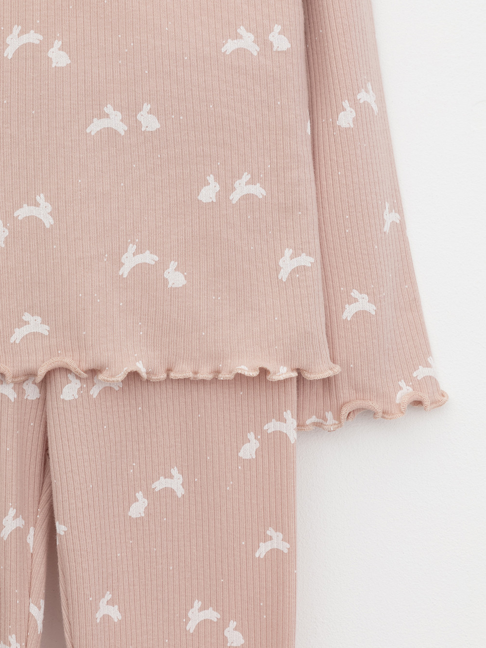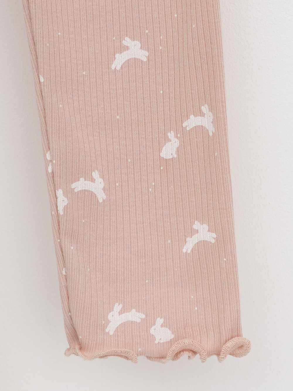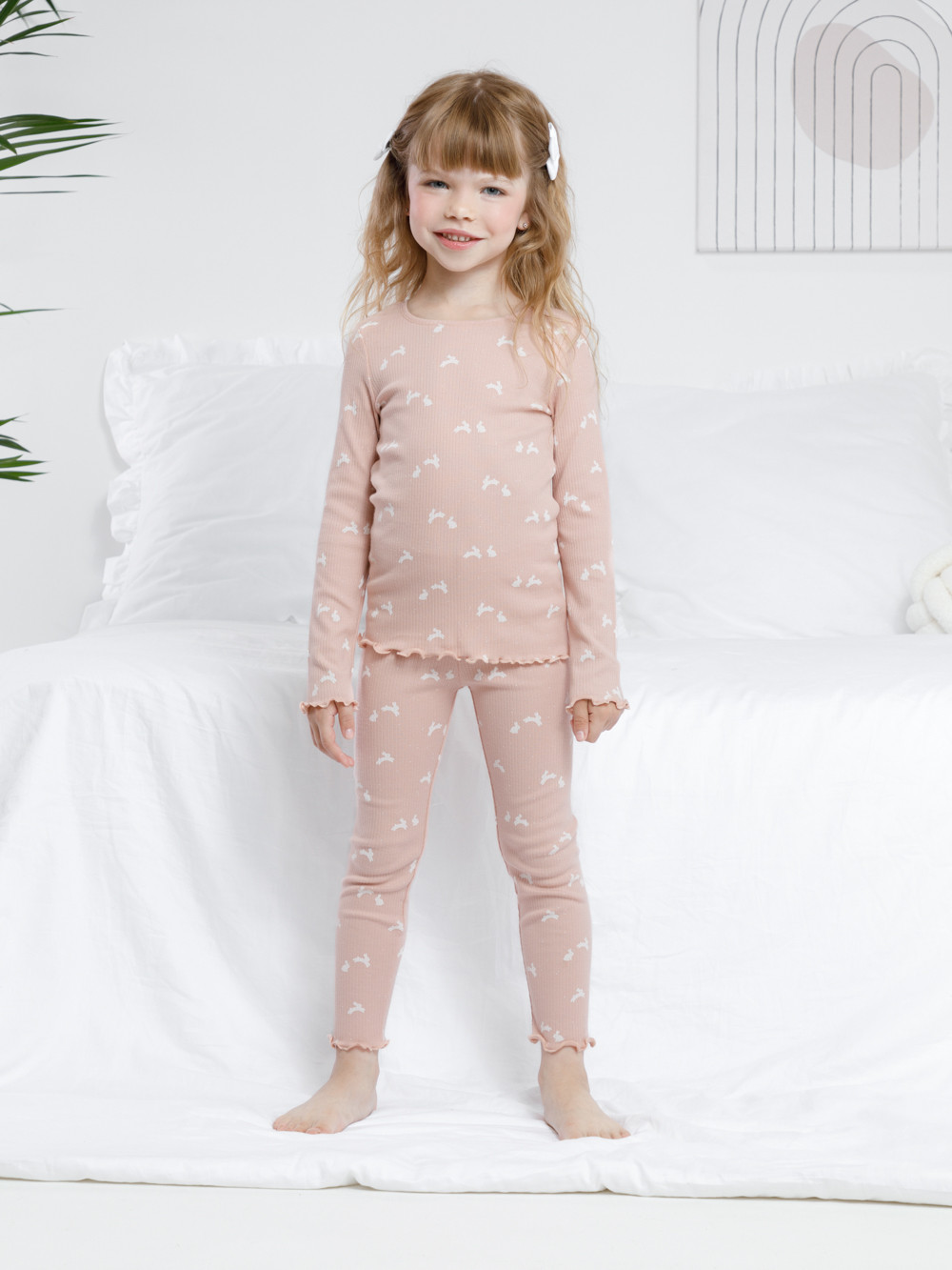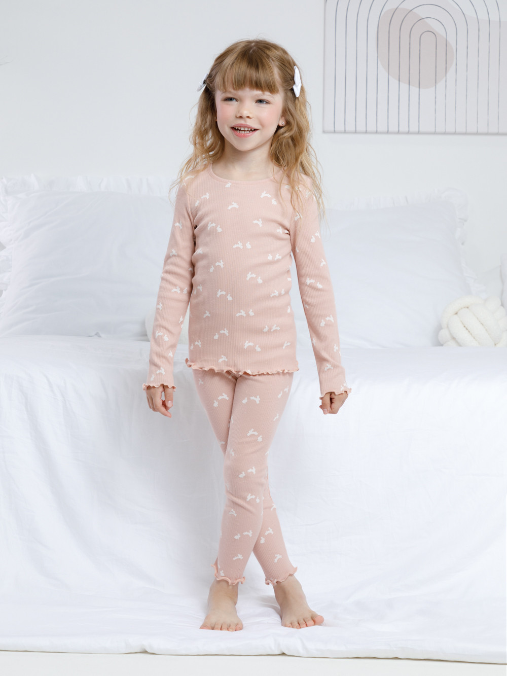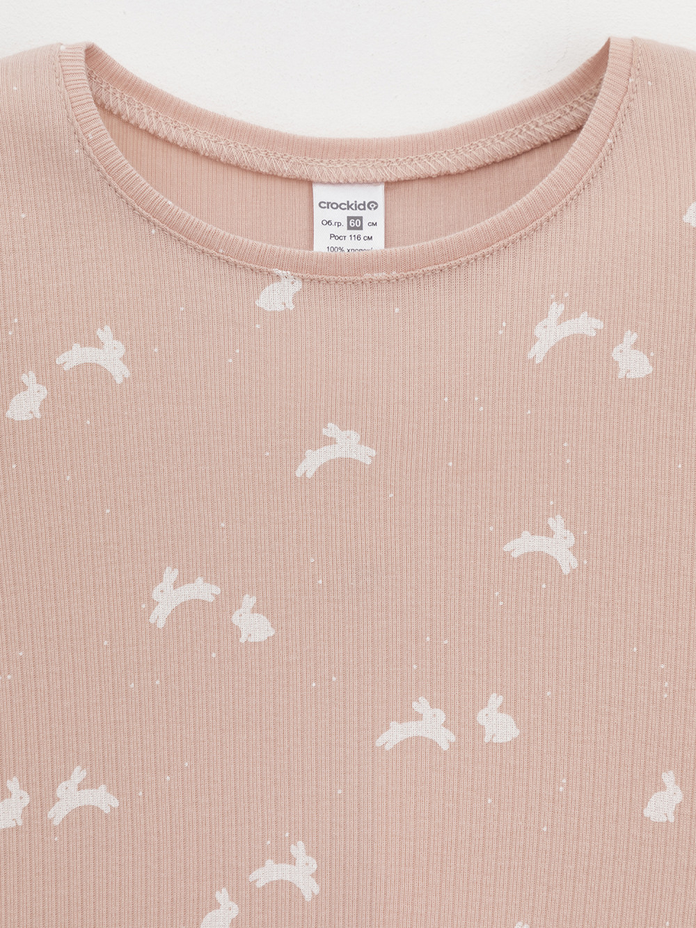Трикотажная пижама в рубчик из натурального хлопка. Джемпер с длинными втачными рукавами и лосины с эластичной резинкой в поясе. Оригинальная набивка выполнена из стойких текстильных гипоаллергенных красителей. Изделие сохраняет цвет и форму после многократных стирок. Все трикотажные полотна производятся в соответствии с нормами швейцарского сертификата ЭкоТекс.