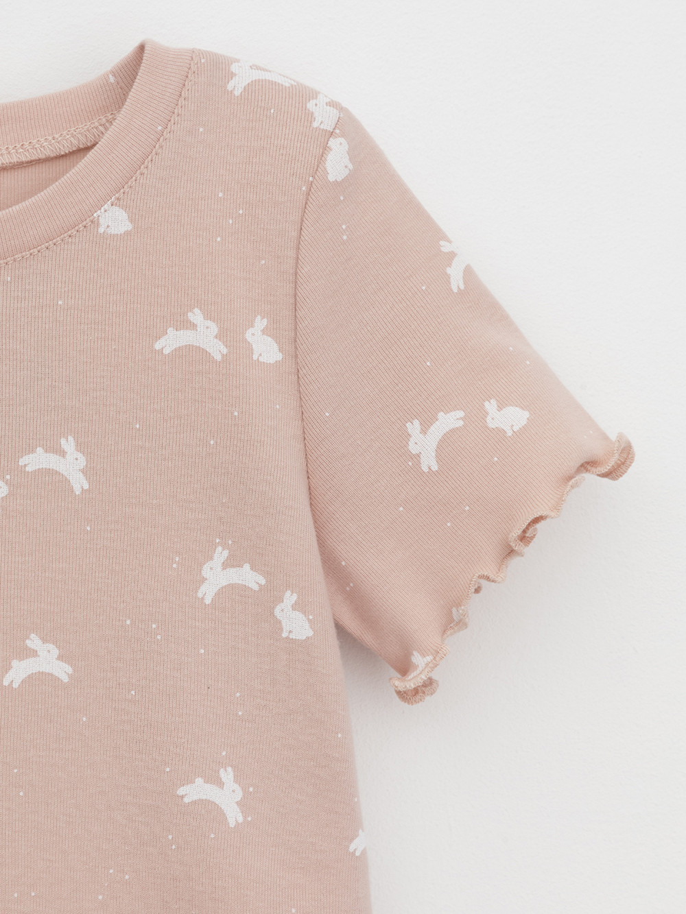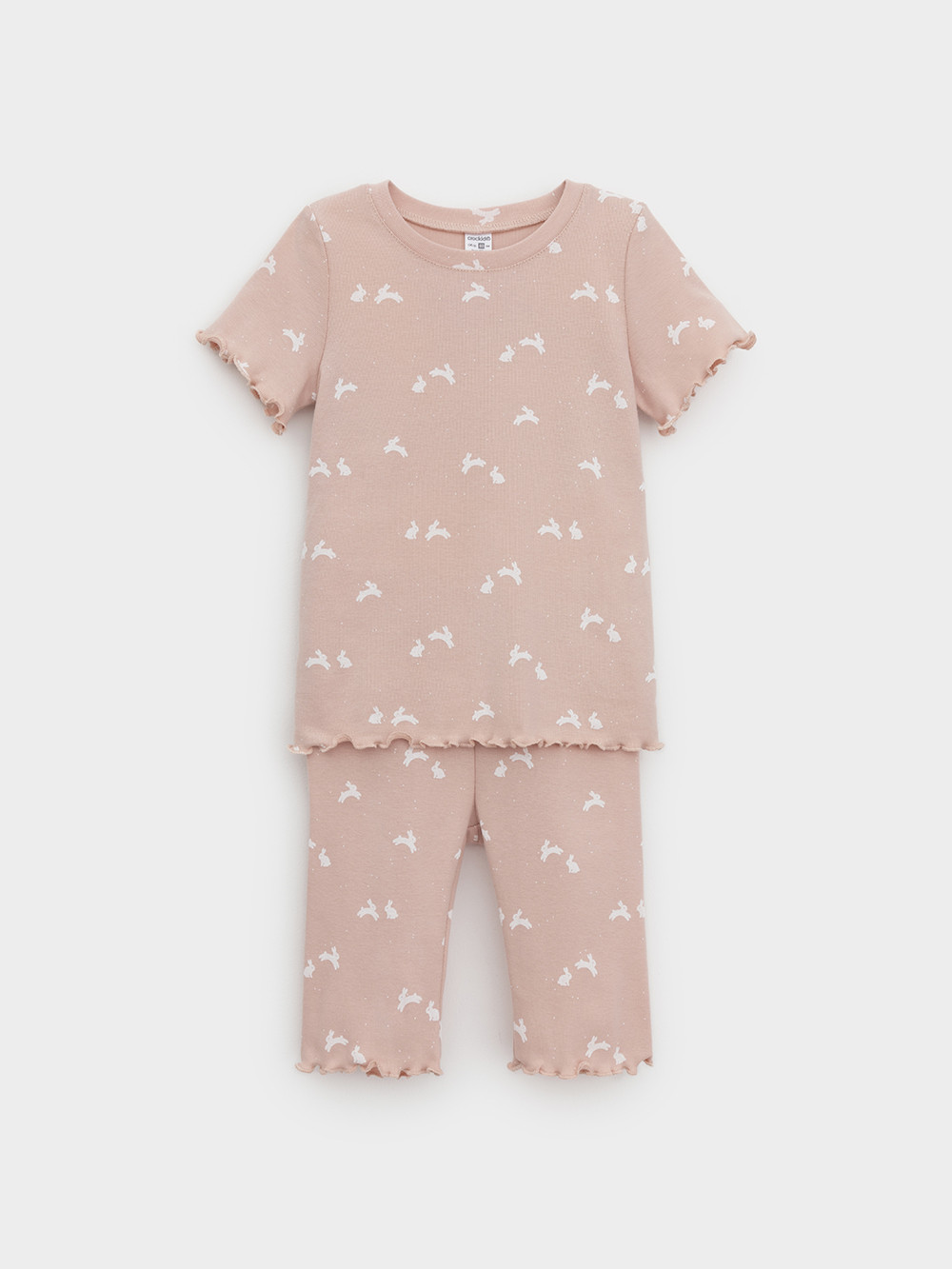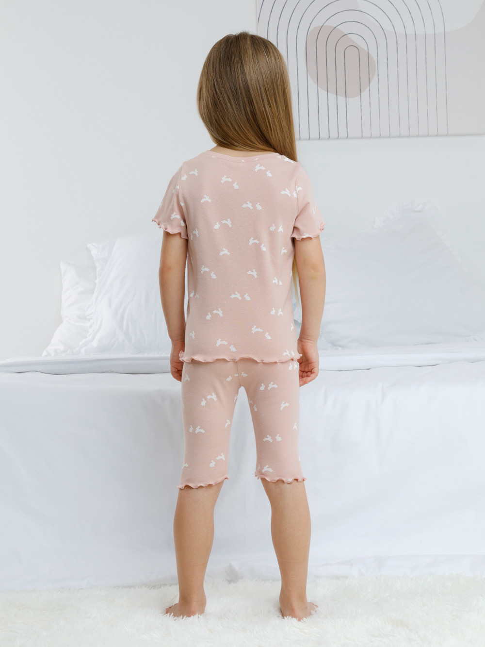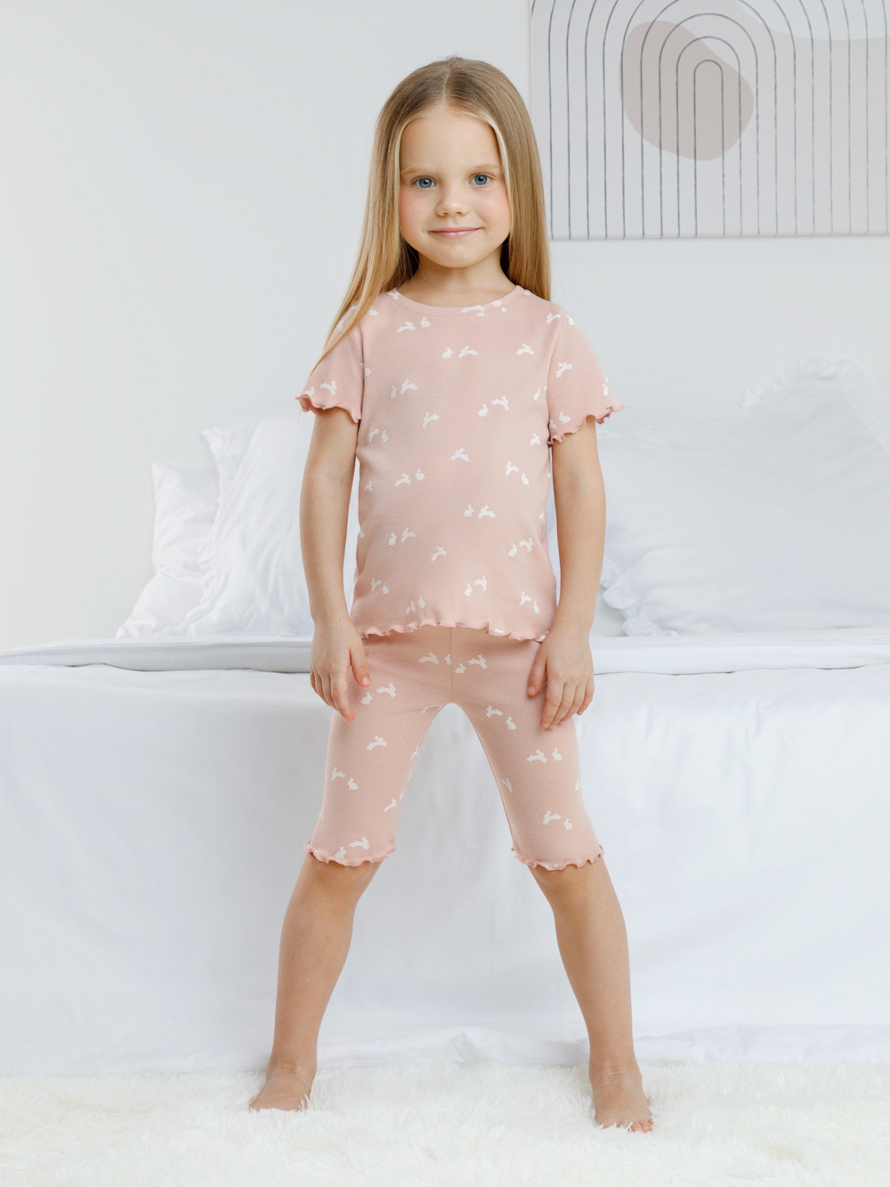 Трикотажная пижама в рубчик из натурального хлопка. Футболка с короткими втачными рукавами и шорты с эластичной резинкой в поясе. Оригинальная набивка выполнена из стойких текстильных гипоаллергенных красителей. Изделие сохраняет цвет и форму после многократных стирок. Все трикотажные полотна производятся в соответсвии с нормами швейцарского сертификата ЭкоТекс.