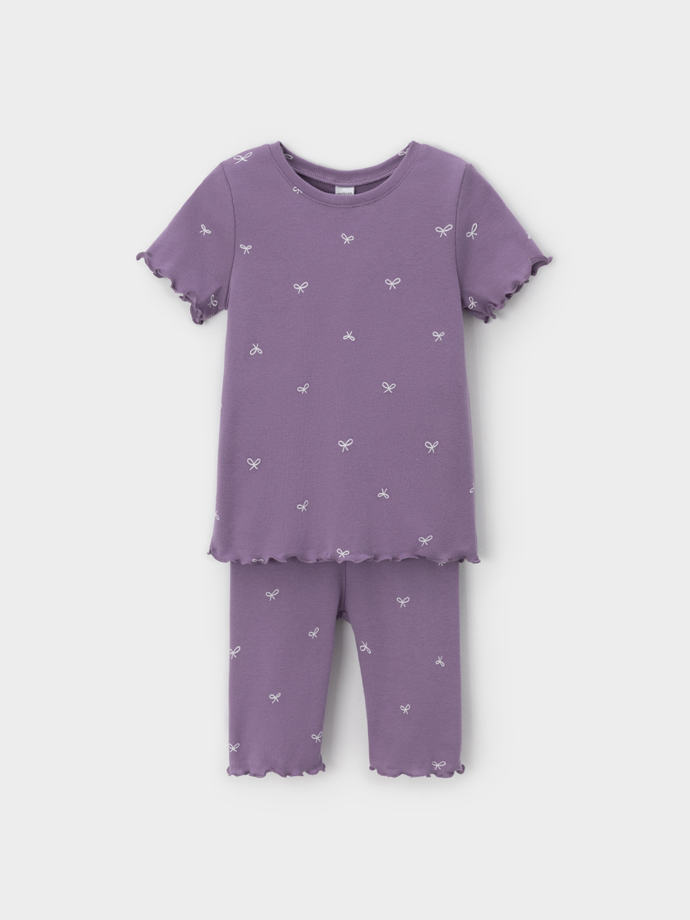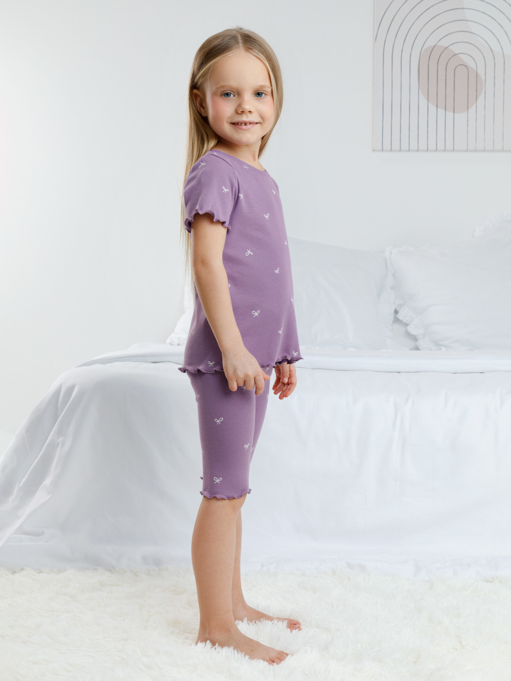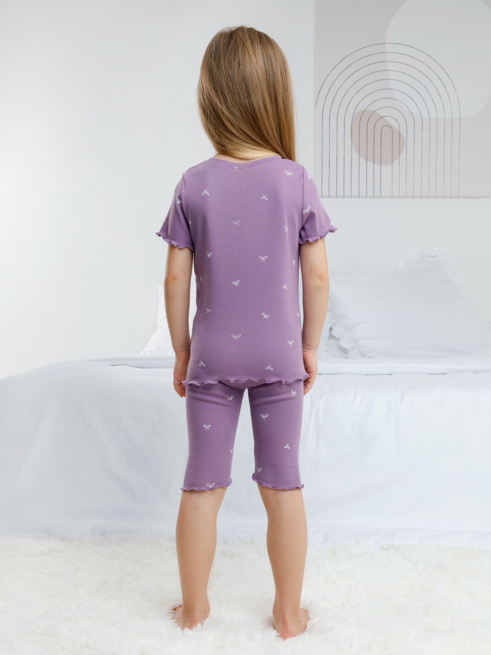Трикотажная пижама в рубчик из натурального хлопка. Футболка с короткими втачными рукавами и шорты с эластичной резинкой в поясе. Оригинальная набивка выполнена из стойких текстильных гипоаллергенных красителей. Изделие сохраняет цвет и форму после многократных стирок. Все трикотажные полотна производятся в соответсвии с нормами швейцарского сертификата ЭкоТекс.