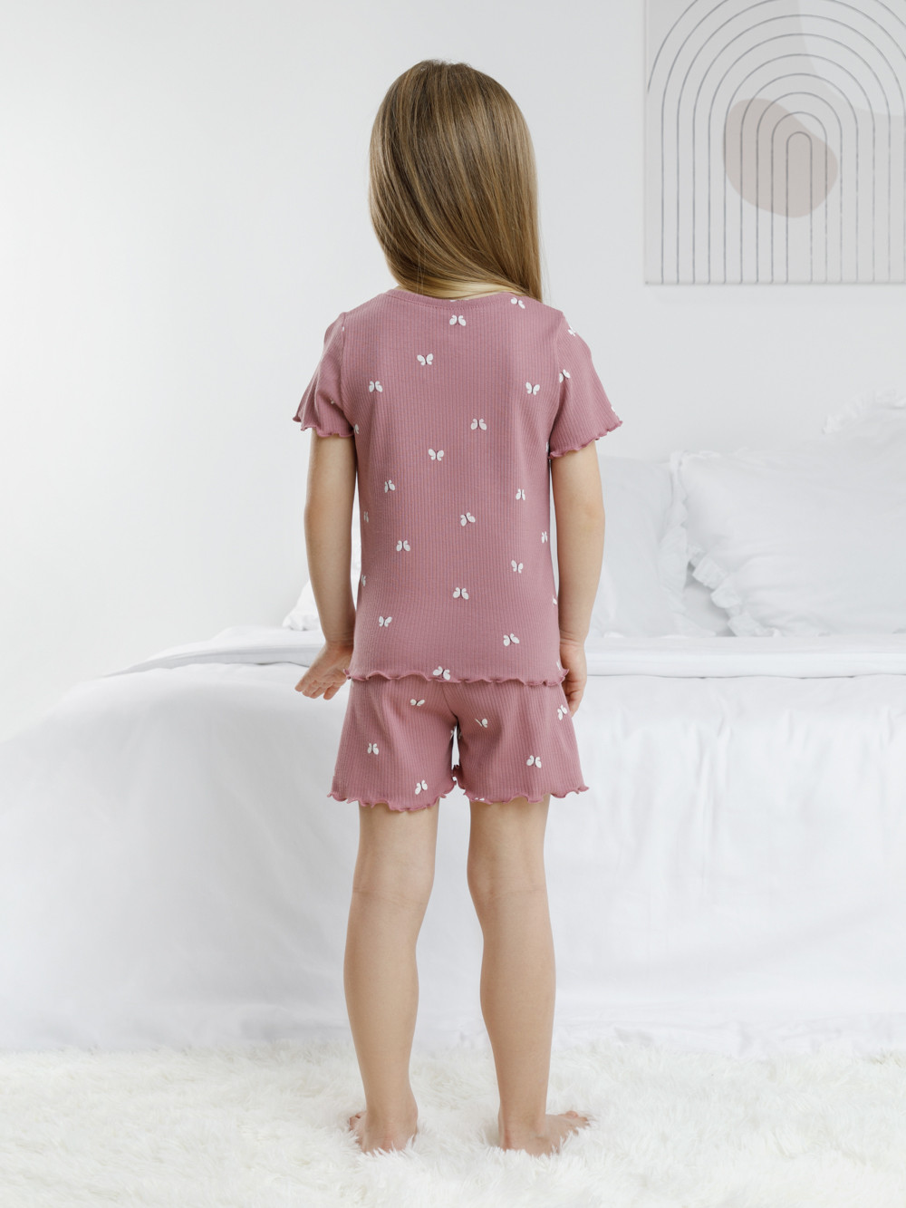 Трикотажная пижама в рубчик из натурального хлопка. Футболка с короткими втачными рукавами и шорты с эластичной резинкой в поясе. Оригинальная набивка выполнена из стойких текстильных гипоаллергенных красителей. Изделие сохраняет цвет и форму после многократных стирок. Все трикотажные полотна производятся в соответсвии с нормами швейцарского сертификата ЭкоТекс.