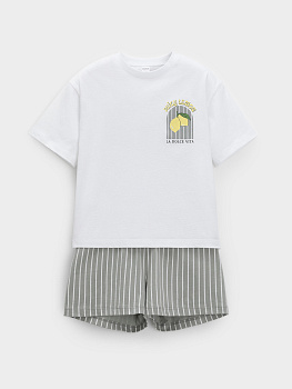 Трикотажная пижама из натурального хлопка для комфортного сна и отдыха. Свободная футболка с короткими спущенными рукавами и шорты с мягкой эластичной резинкой в поясе. Оригинальный рисунок выполнен из стойких текстильных гипоаллергенных красителей. Изделие сохраняет цвет и форму после многократных стирок. Все трикотажные полотна производятся в соответствии с нормами швейцарского сертификата ЭкоТекс.