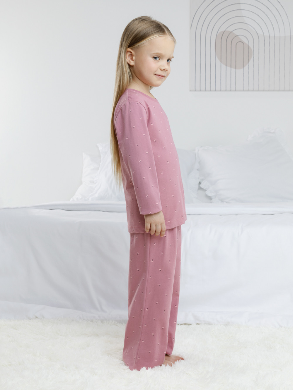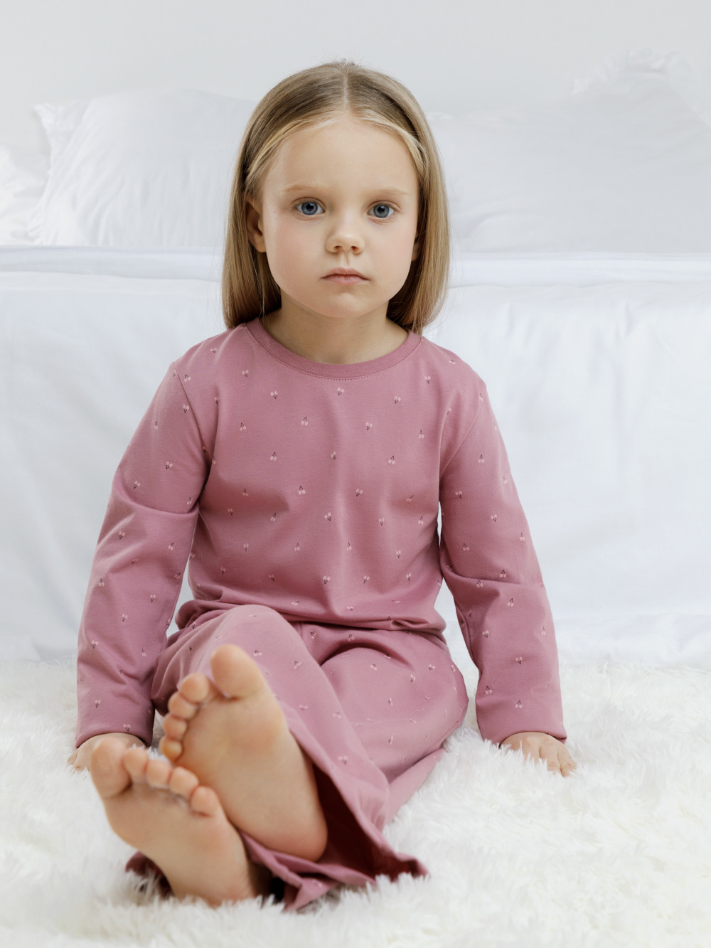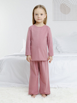 Пижама для девочки из натурального хлопка. Джемпер с длинными втачными рукавами и прямые брюки с эластичной резинкой в поясе. Оригинальная набивка выполнена из стойких текстильных гипоаллергенных красителей. Изделие сохраняет цвет и форму после многократных стирок. Все трикотажные полотна производятся в соответствии с нормами швейцарского сертификата ЭкоТекс.