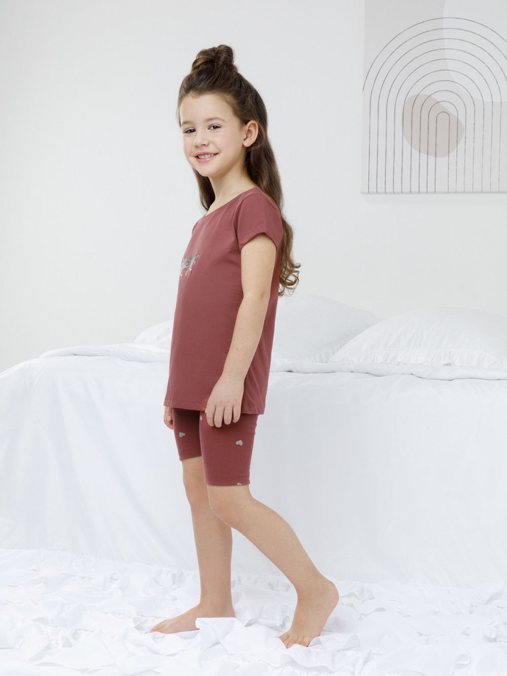 Трикотажная пижама для девочки с футболкой и велосипедками. Футболка с короткими рукавами изготовлена из гладкого трикотажа супрем. Велосипедки с резинкой в поясе выполнены из эластичного материала в рубчик. Оригинальная набивка и принт выполнены из стойких текстильных гипоаллергенных красителей. Изделие сохраняет цвет и форму после многократных стирок. Все трикотажные полотна производятся в соответствии с нормами швейцарского сертификата ЭкоТекс.