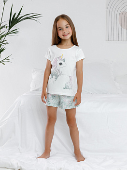 Трикотажная пижама из натурального хлопка. Футболка с принтом и короткими спущенными рукавами. У шорт в комплекте мягкий, эластичный пояс на резинке. Оригинальная набивка выполнена из стойких, гипоаллергенных текстильных красителей. Комплект сохраняет цвет и форму после многократных стирок. Все трикотажные полотна производятся в соответсвии с нормами Швейцарского сертификата ЭкоТекс.