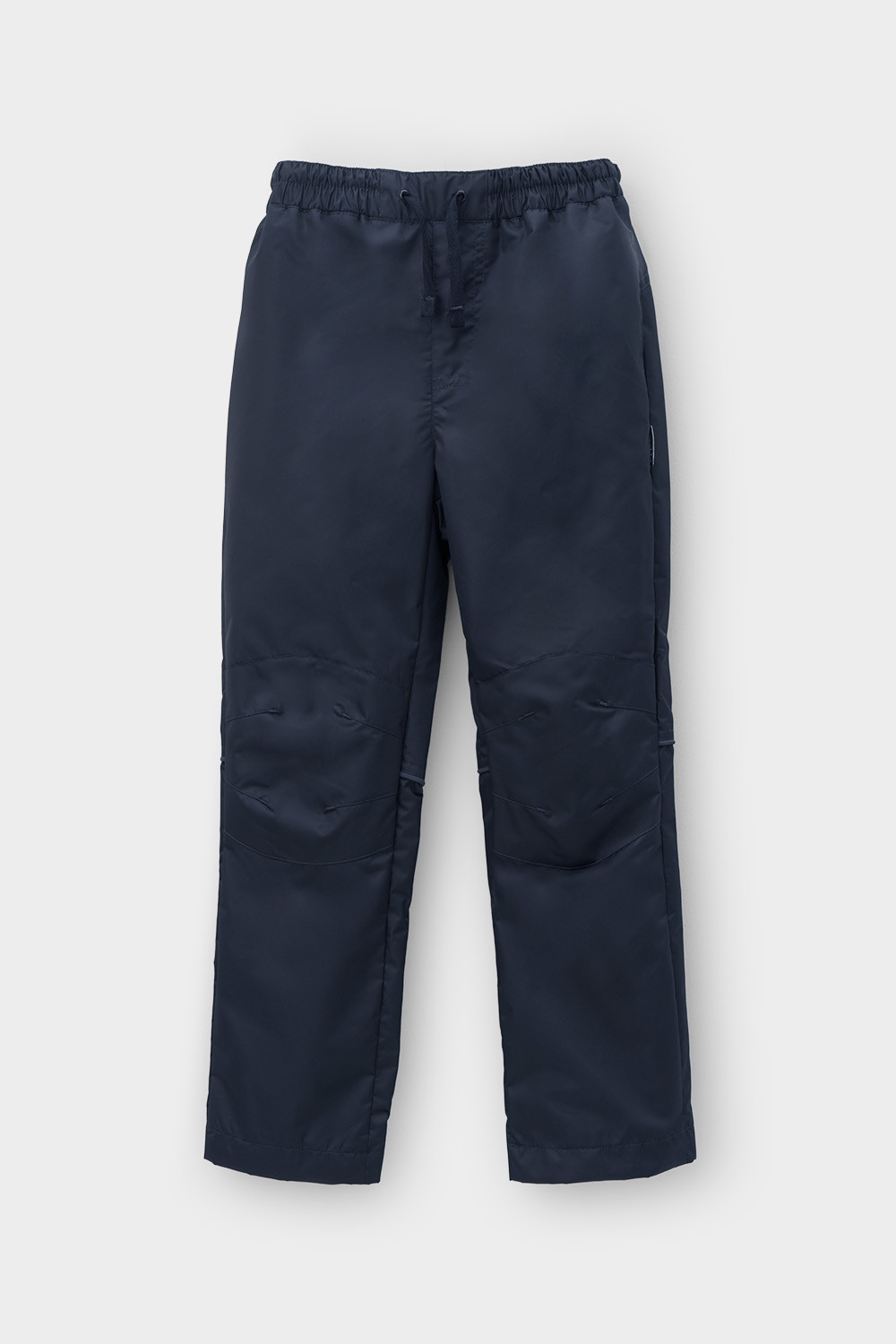 Ветровочные брюки из мембранной, фактурной ткани с дополнительной тефлоновой обработкой. Данный вид обработки предохраняет изделие от загрязнения и лучше отводит влагу. Подклад из 100% полиэстера - флиса. Область коленей дополнительно усилена деталями из основной ткани. В поясе предусмотрен шнурок для регулировки ширины изделия. Во всех изделиях верхнего ассортимента для безопасности ребенка предусмотрены светоотражающие элементы.