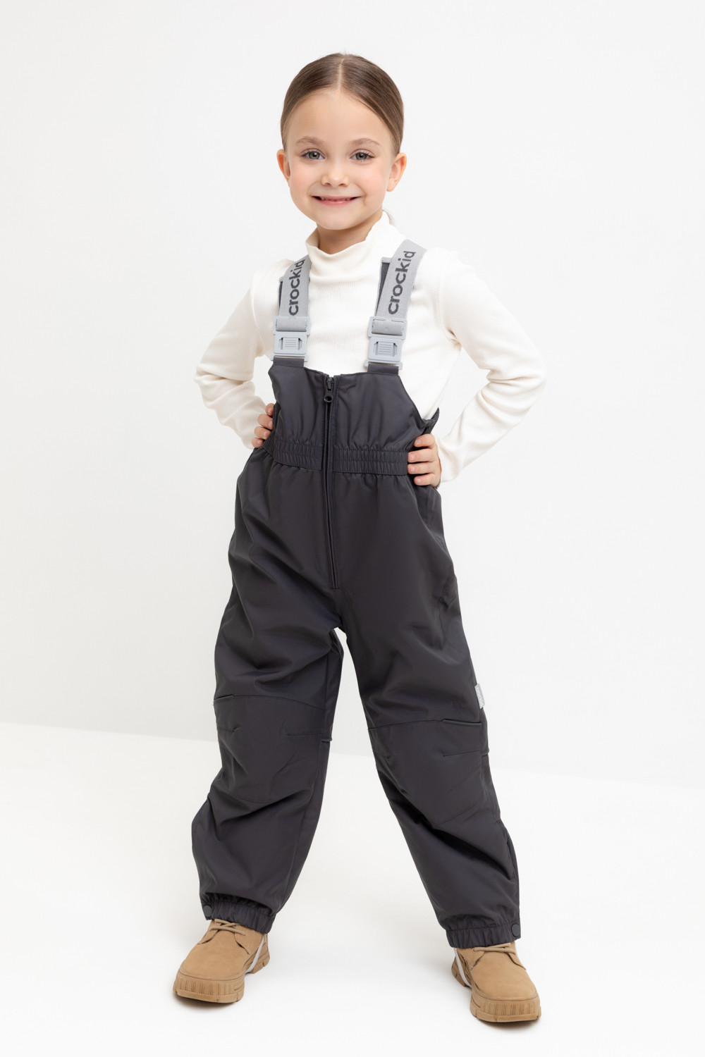 Демисезонный полукомбинезон детский с утеплителем 60г/м2. Выполнен из мембранной ткани с дополнительной тефлоновой обработкой. Данный вид обработки предохраняет изделие от загрязнения и лучше отводит влагу. Подклад из 100% полиэстра. Эластичные лямки для удобства регулируются по длине. Область коленей дополнительно усилена деталями из основной ткани. Низ на резинке, регулируется по ширине при помощи кнопки. Для фиксации полукомбинезона используются съемные силиконовые штрипки. Во всех изделиях верхнего ассортимента для безопасности ребенка предусмотрены светоотражающие элементы.