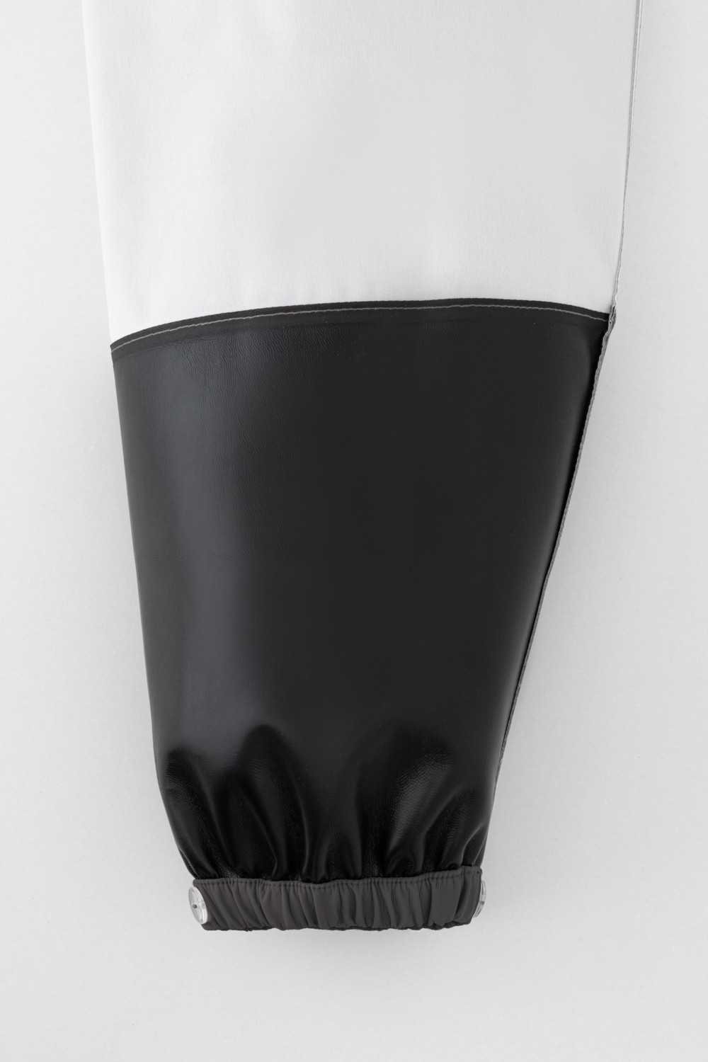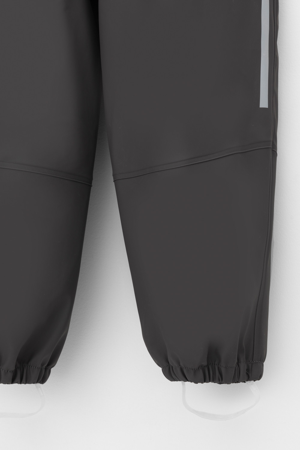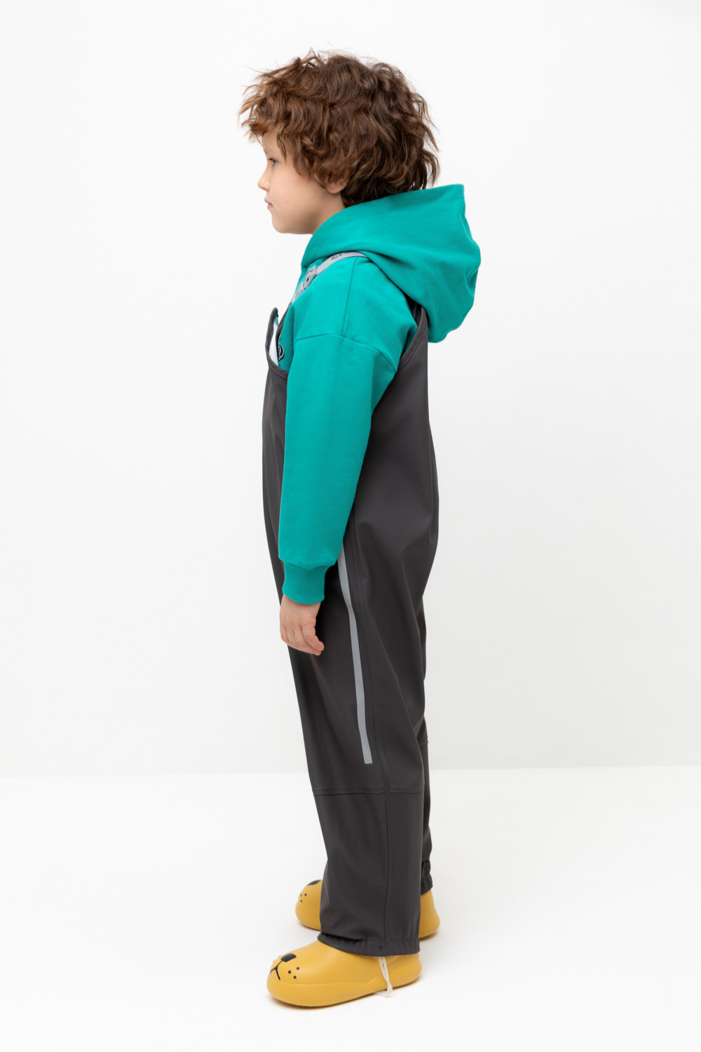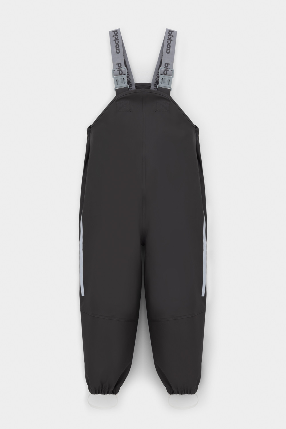 Полукомбинезон без подкладки, непромокаемый, на эластичных бретелях с регулировкой длины при помощи фастекса, сбоку под проймой кнопки для регулировки объема, низ брючин с эластичной резинкой. Для фиксации полукомбинезона используются съемные силиконовые штрипки. Светоотражающий принт в виде полосы сбоку.
