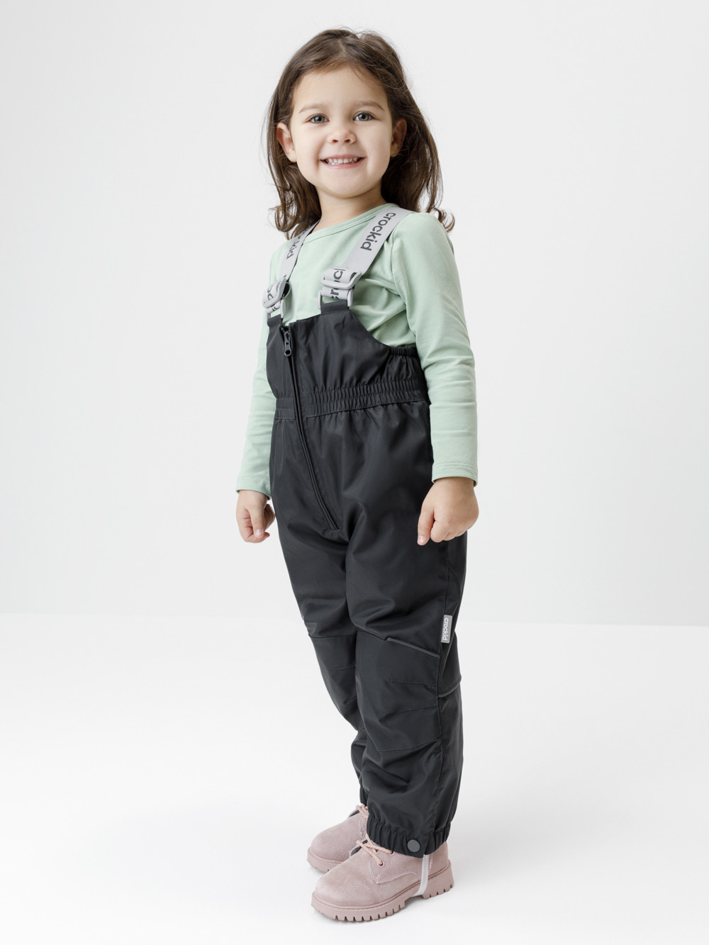 Демисезонный полукомбинезон детский с утеплителем 60 г/м2. Выполнен из мембранной ткани с дополнительной тефлоновой обработкой. Данный вид обработки предохраняет изделие от загрязнения и лучше отводит влагу. Подклад из 100% полиэстера. Эластичные лямки для удобства регулируются по длине. Область коленей дополнительно усилена деталями из основной ткани. Низ на резинке, регулируется по ширине при помощи кнопки. Для фиксации полукомбинезона используются съёмные силиконовые штрипки. Во всех изделиях верхнего ассортимента для безопасности ребёнка предусмотрены светоотражающие элементы.