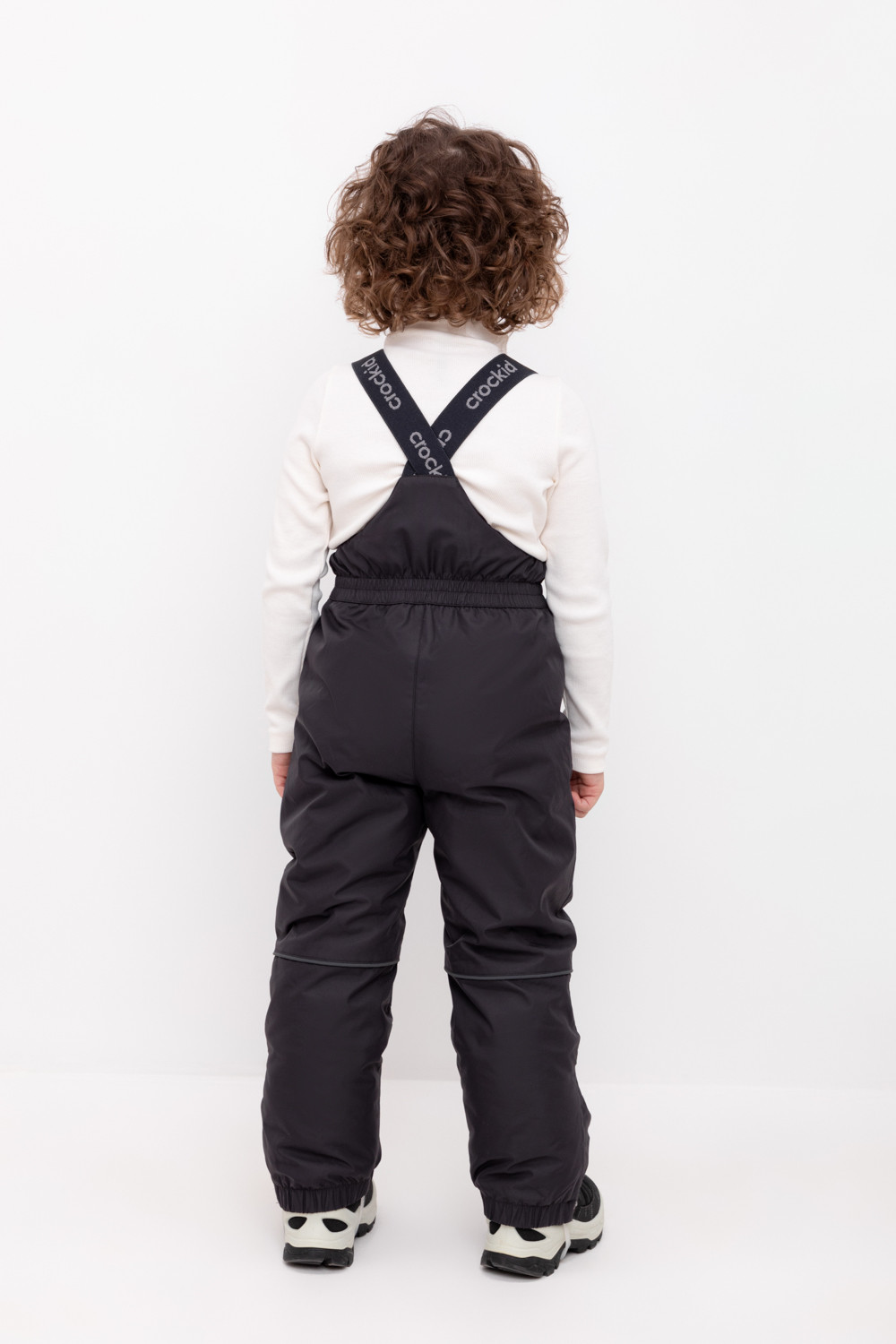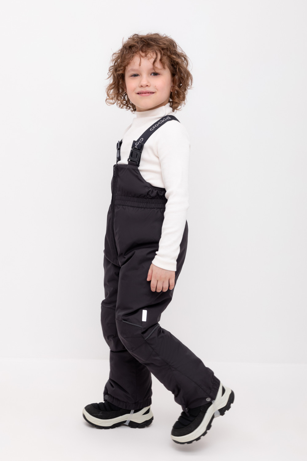 Зимний детский полукомбинезон с утеплителем 200 г/м2 из мембранной ткани с дополнительной тефлоновой обработкой, которая предохраняет изделие от загрязнений и отталкивает влагу. Подклад выполнен из мягкого полиэстера Tricot. Благодаря высокой талии и подтяжкам с регулировкой по росту брюки идеально сидят на фигуре. Застёжка на молнии облегчает одевание. Колени с анатомическим кроем усилены дополнительными вставками из основной ткани. Низ регулируется под ширину обуви при помощи кнопки. Силиконовые штрипки и внутренняя противоснежная юбка  защищают обувь от попадания снега и удерживают брюки в закреплённом положении. Во всех изделиях верхнего ассортимента для безопасности ребёнка предусмотрены светоотражающие элементы.