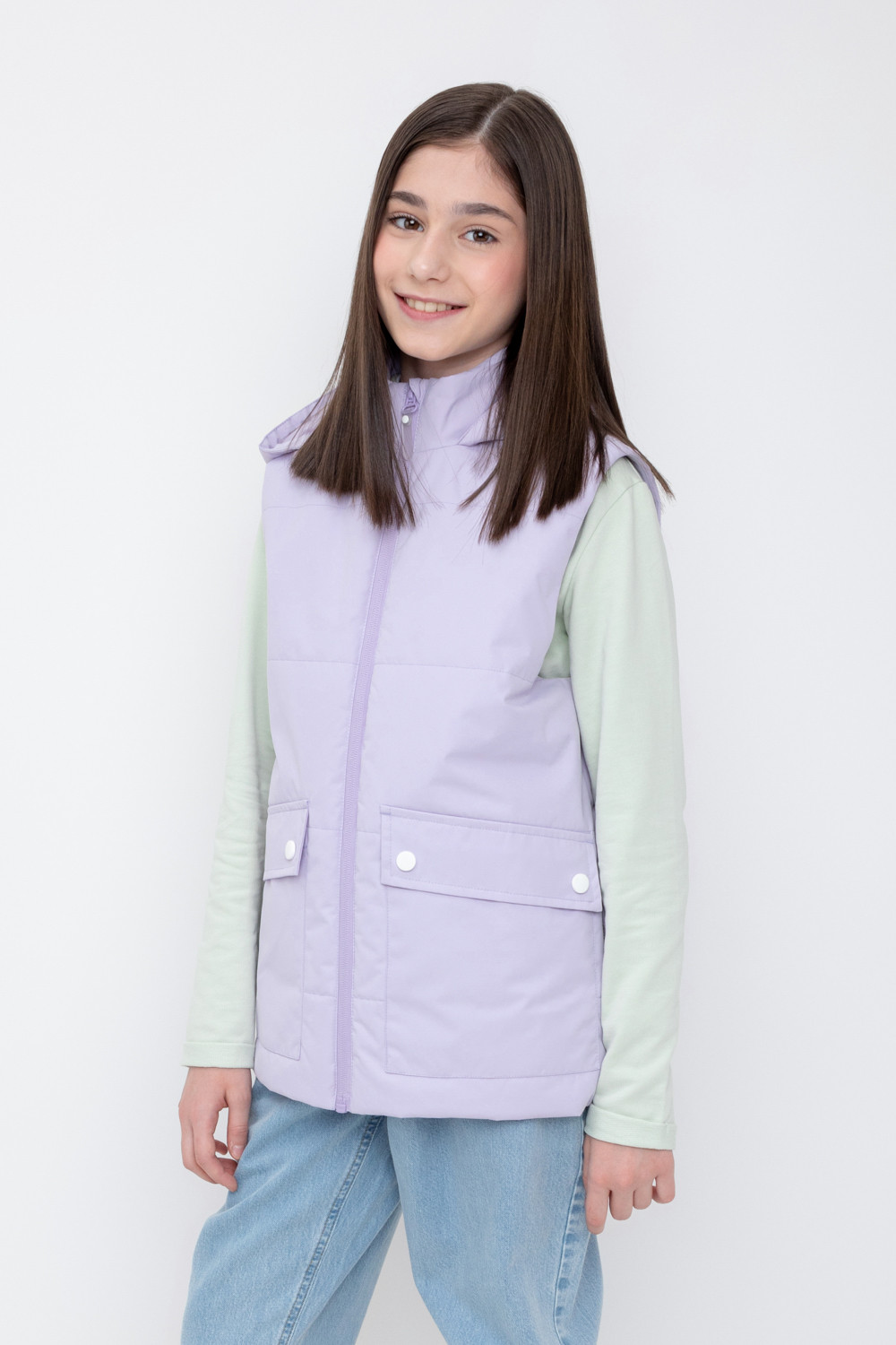 Стеганный жилет с капюшоном для девочки с утеплителем Fellex®: 120 г/м2. Выполнен из мембранной ткани с дополнительной тефлоновой обработкой и матовым покрытием. Данный вид обработки предохраняет изделие от загрязнения и лучше отводит влагу. Подклад из 100% полиэстра. У изделия предусмотрена защита подбородка. Накладные карманы с клапанами на кнопках. Во всех изделиях верхнего ассортимента для безопасности ребенка предусмотрены светоотражающие элементы.