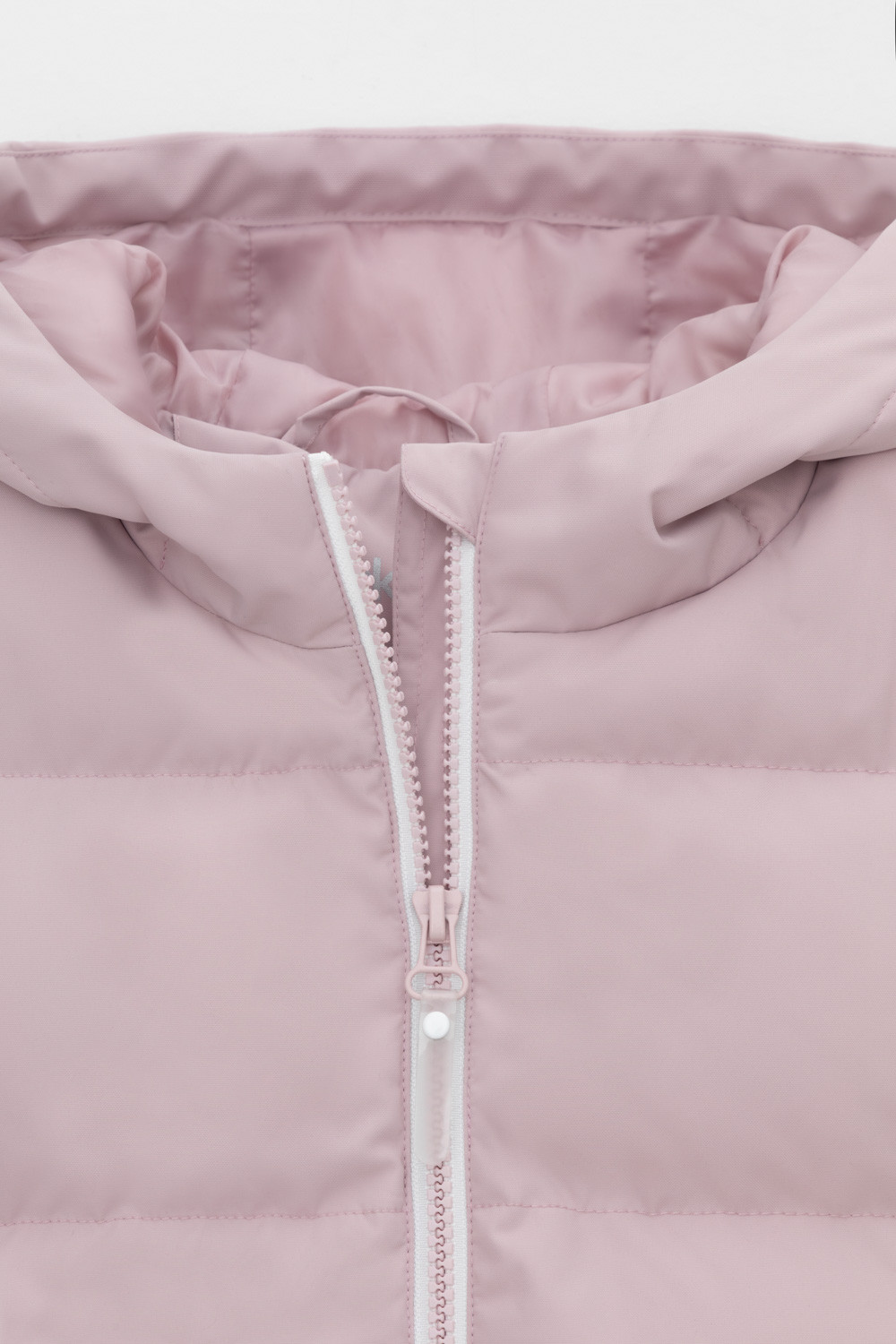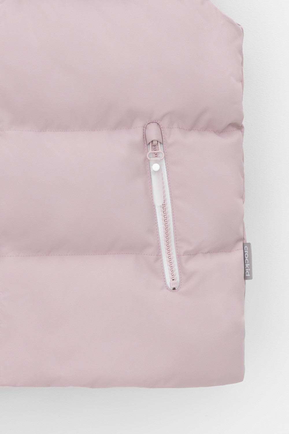 Стеганый жилет с капюшоном для девочки с утеплителем Fellex®: 120 г/м2. Выполнен из мембранной ткани с дополнительной тефлоновой обработкой. Данный вид обработки предохраняет изделие от загрязнения и лучше отводит влагу. Подклад из 100% полиэстра. Капюшон не снимается. Изделие застёгивается на молнию, предусмотрена защита подбородка. Два кармана по бокам застёгиваются на молнии. Во всех изделиях верхнего ассортимента для безопасности ребенка предусмотрены светоотражающие элементы.