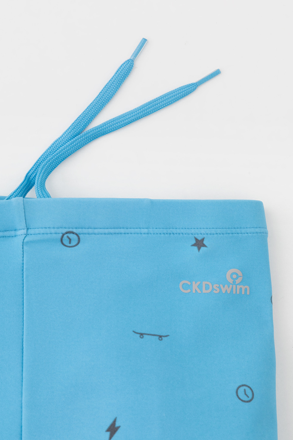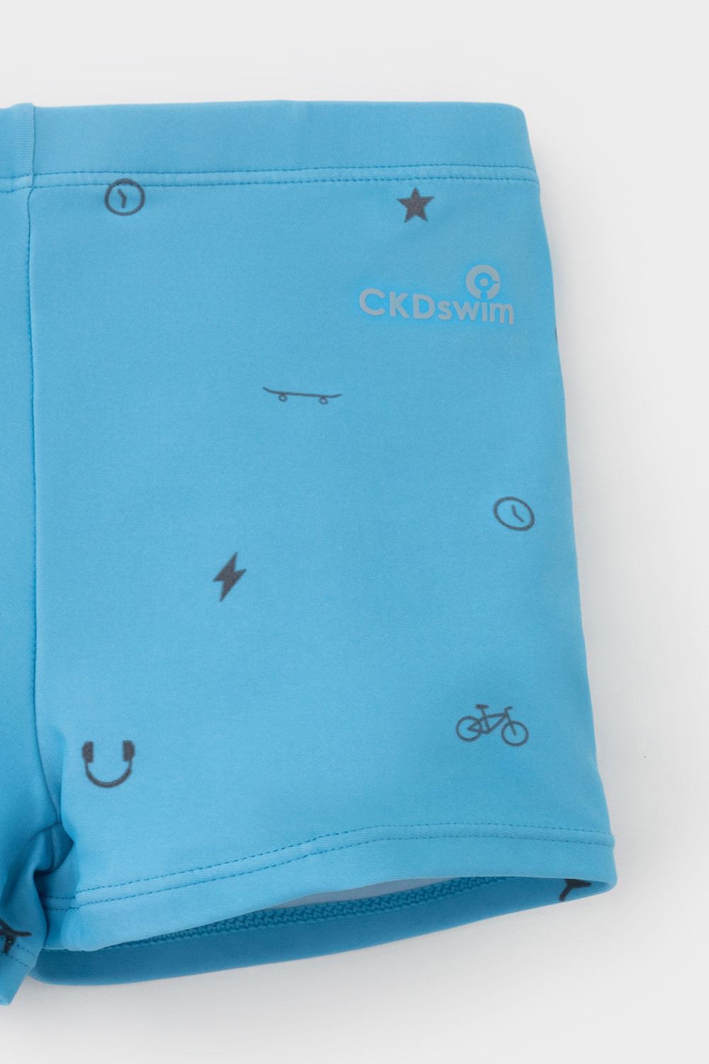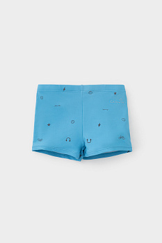 Плавки для мальчика с эластичной резинкой в поясе. Регулируются по ширине с помощью шнурка. Украшены набивным рисунком и принтом с логотипом.