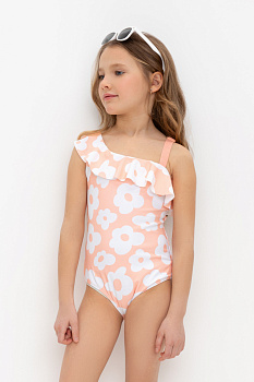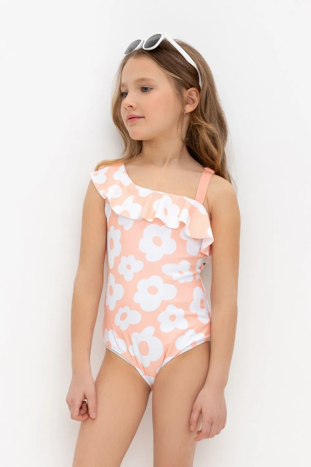 Слитный купальник на лямках для девочки. Украшен оборками. Оригинальная набивка выполнена из стойких гипоаллергенных красителей.