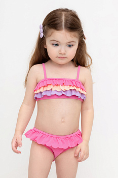 Раздельный купальник для девочки. Топ на эластичных бретелях. Плавки с оборкой на резинке. На груди и спинке воздушные оборки.