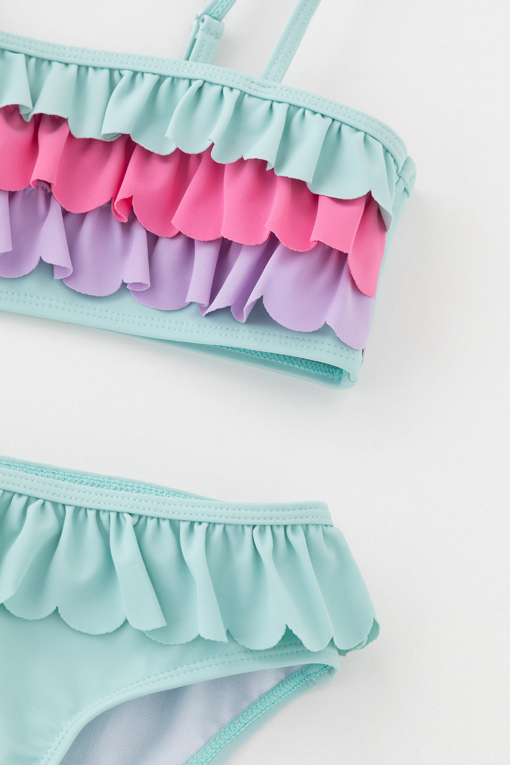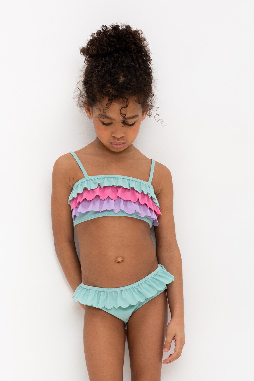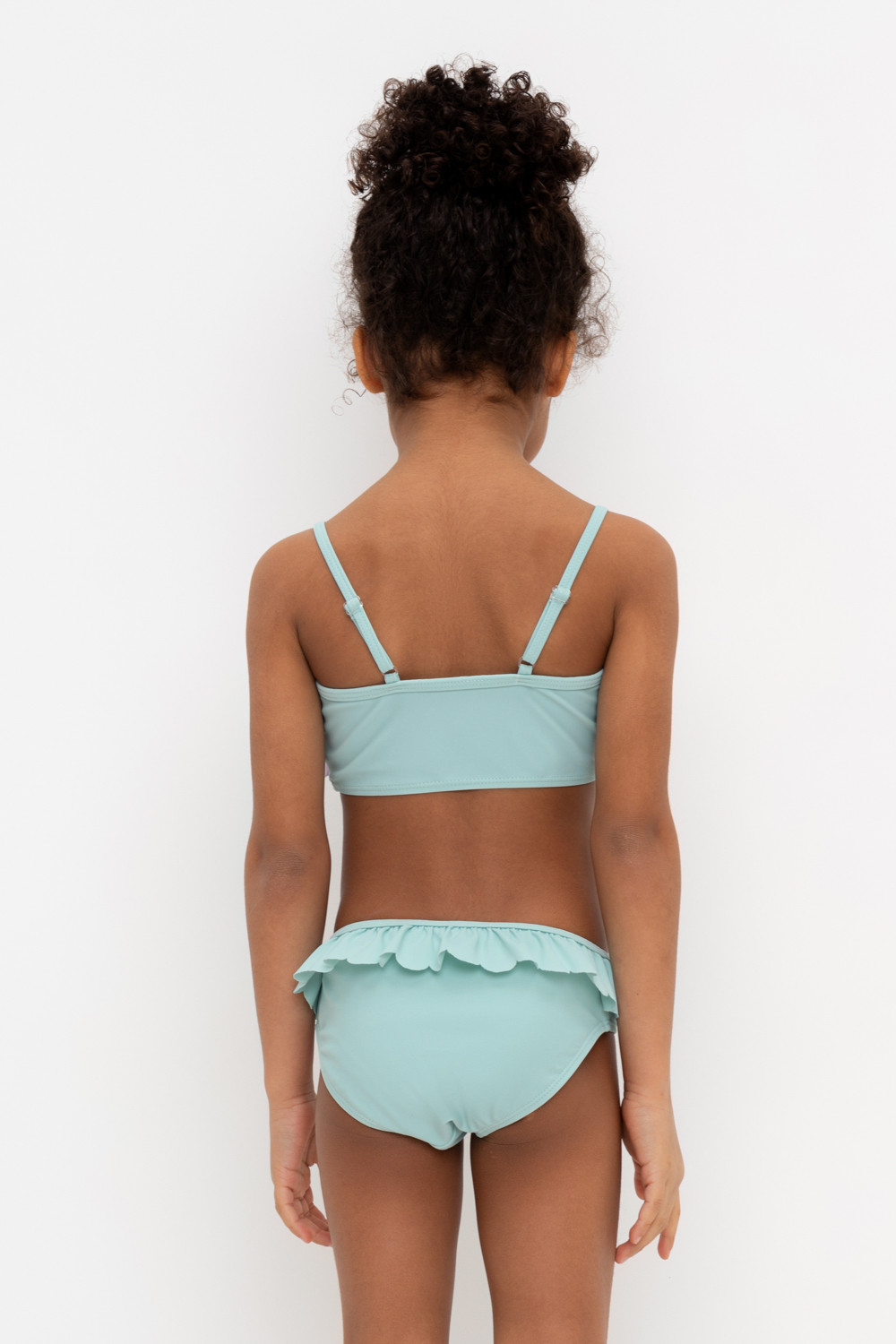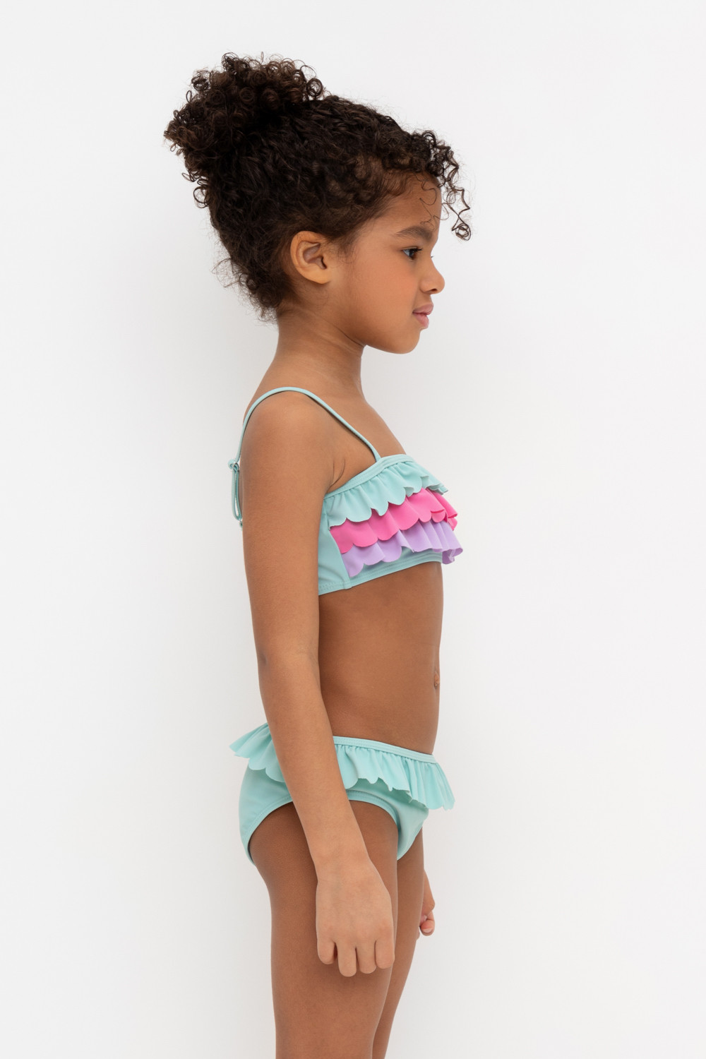 Раздельный купальник для девочки. Топ на эластичных бретелях. Плавки с оборкой на резинке. На груди и спинке воздушные оборки.
