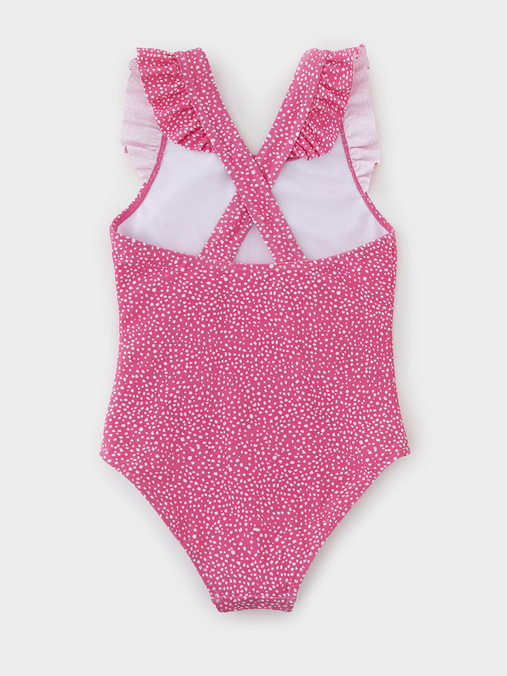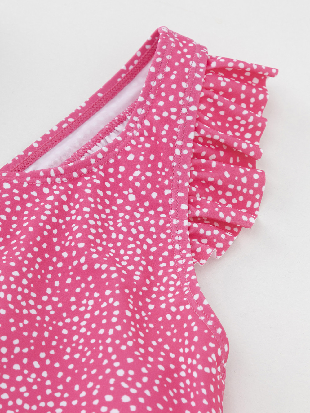 Слитный купальник на бретелях для девочки. Украшен оборками. Внутри подклад. Оригинальная набивка выполнена из стойких гипоаллергенных красителей.