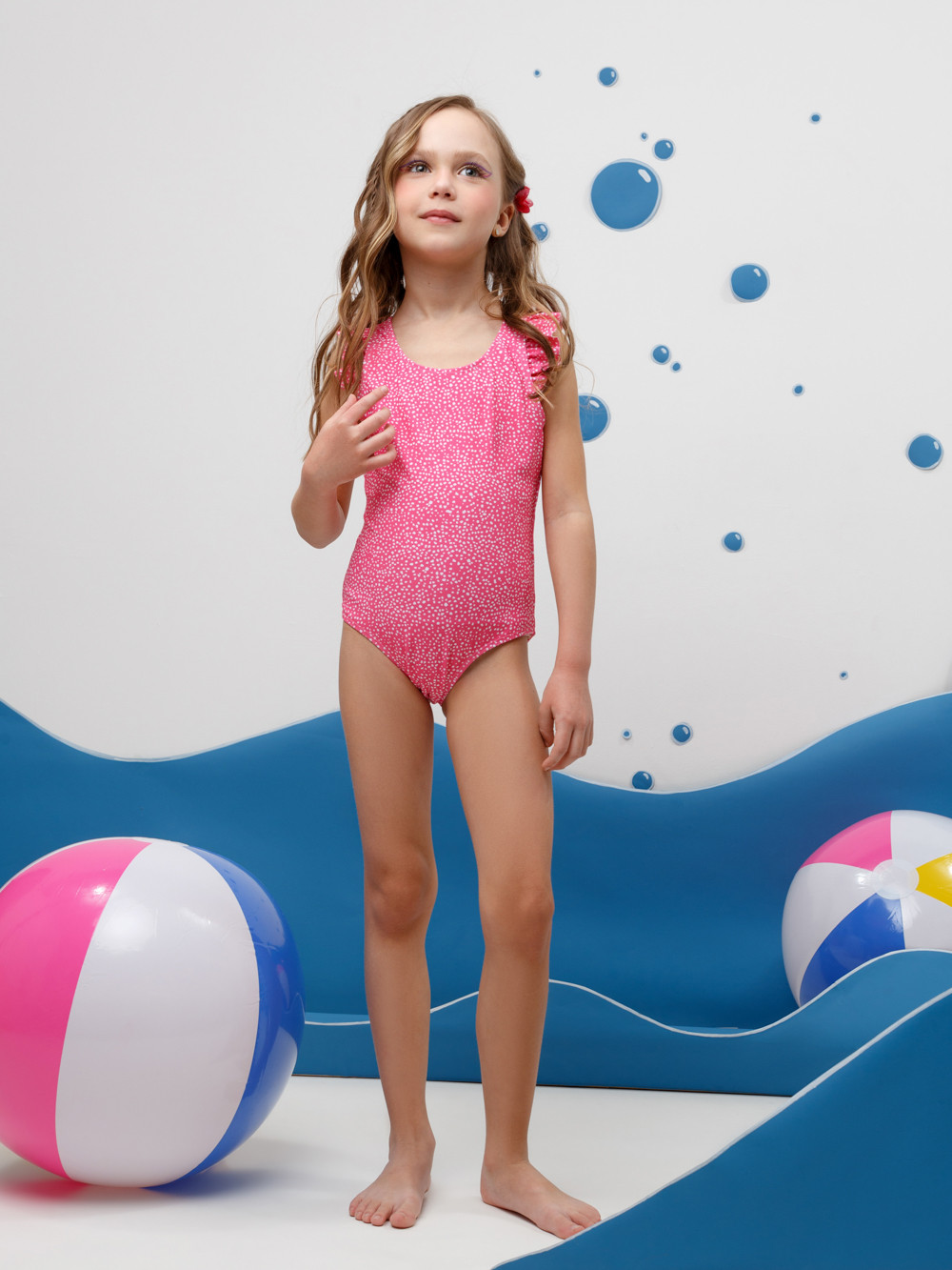 Слитный купальник на бретелях для девочки. Украшен оборками. Внутри подклад. Оригинальная набивка выполнена из стойких гипоаллергенных красителей.