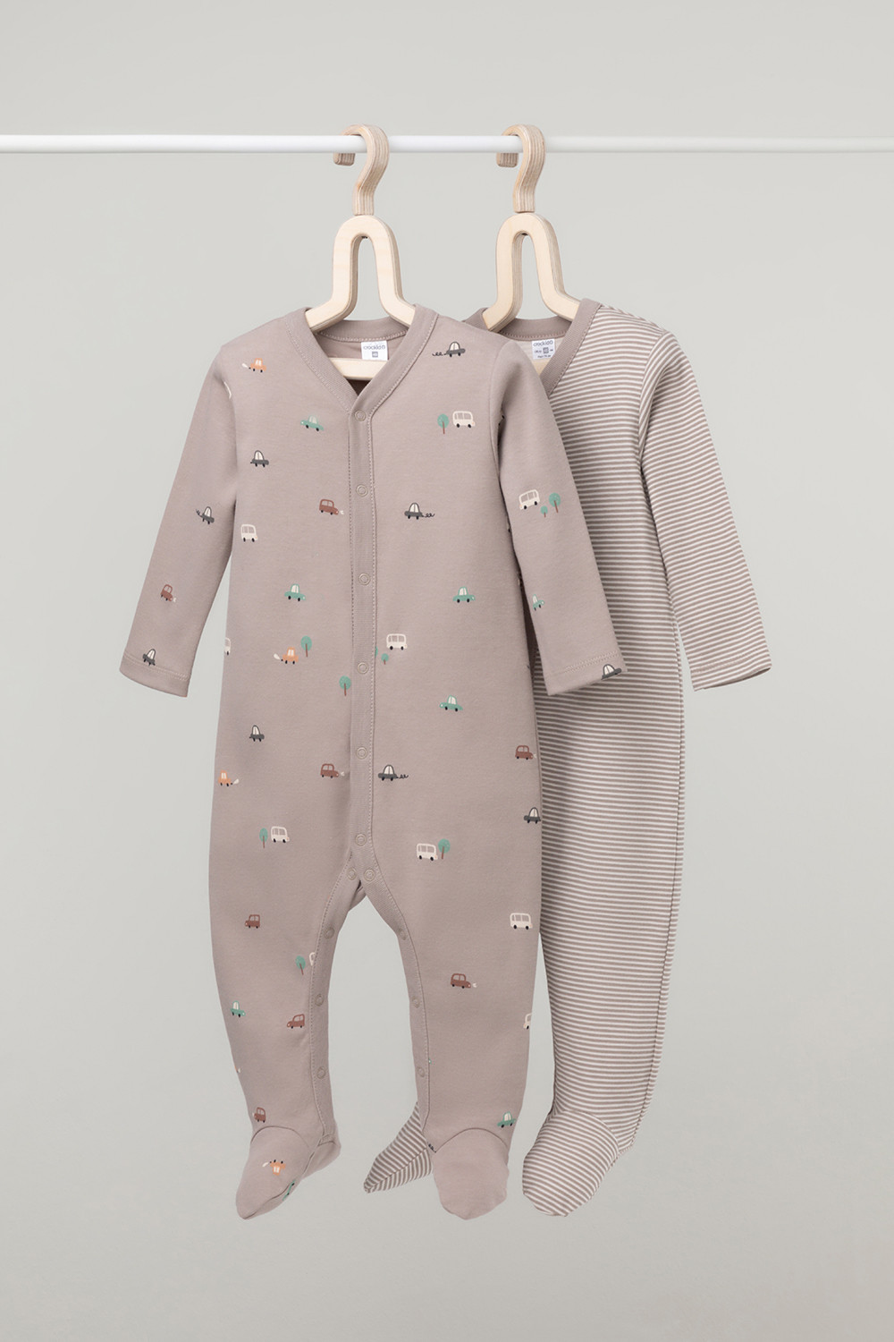 Комбинезоны для новорождённых из мягкого эластичного трикотажа интерлок, произведённого из натурального хлопка. В упаковке 2 штуки. Застёгиваются сбоку на молнию и на кнопку. Длинные рукава-реглан оканчиваются манжетами. Оригинальная набивка выполнена из стойких гипоаллергенных текстильных красителей. Все трикотажные полотна производятся в соответствии с нормами Швейцарского сертификата ЭкоТекс.